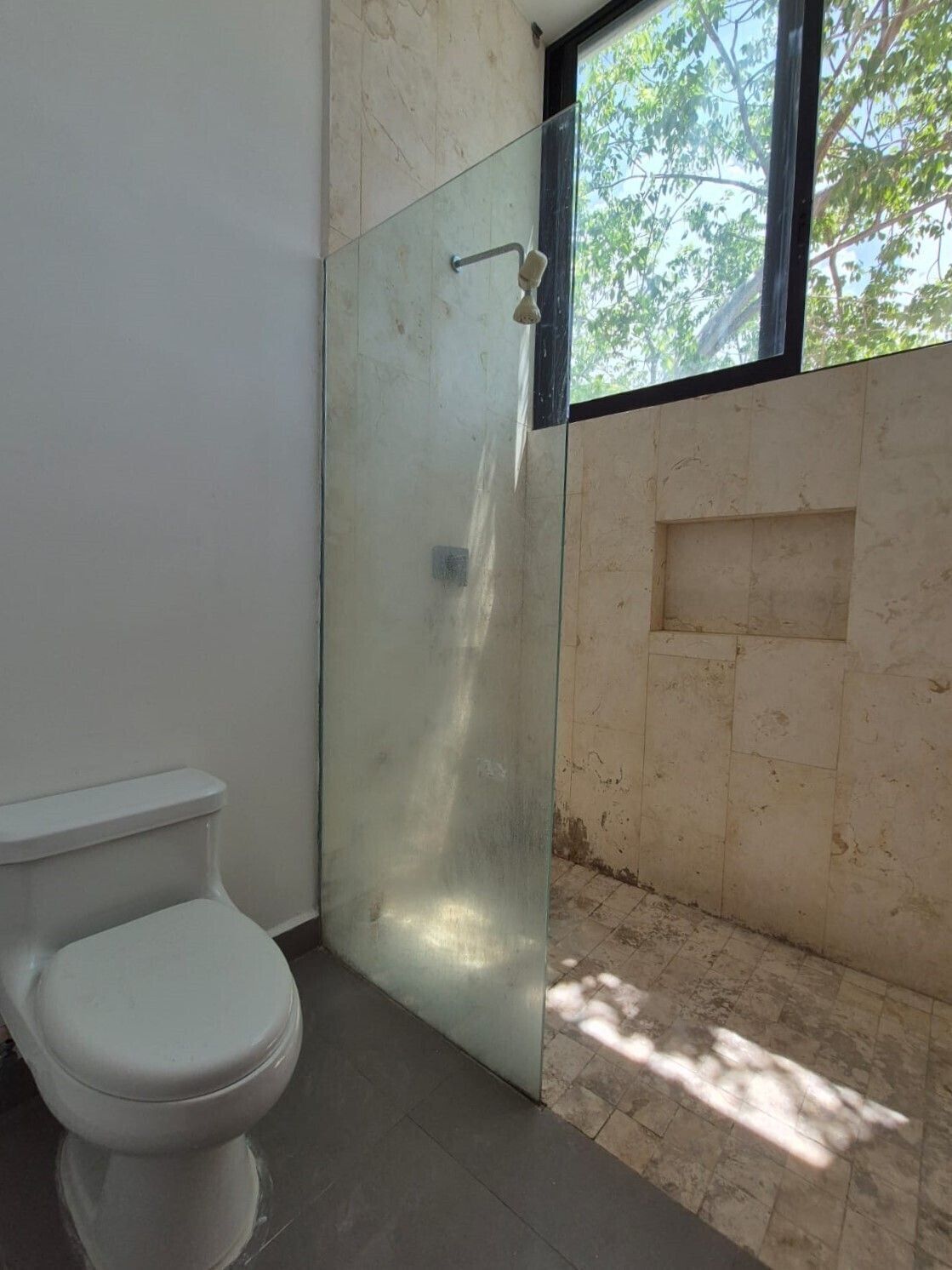 En planta alta la recámara principal tiene clóset vestidor amplio, baño con cancel de vidrio templado, puerta de privacidad para inodoro , techo a doble altura y ventanal con vista a la terraza.