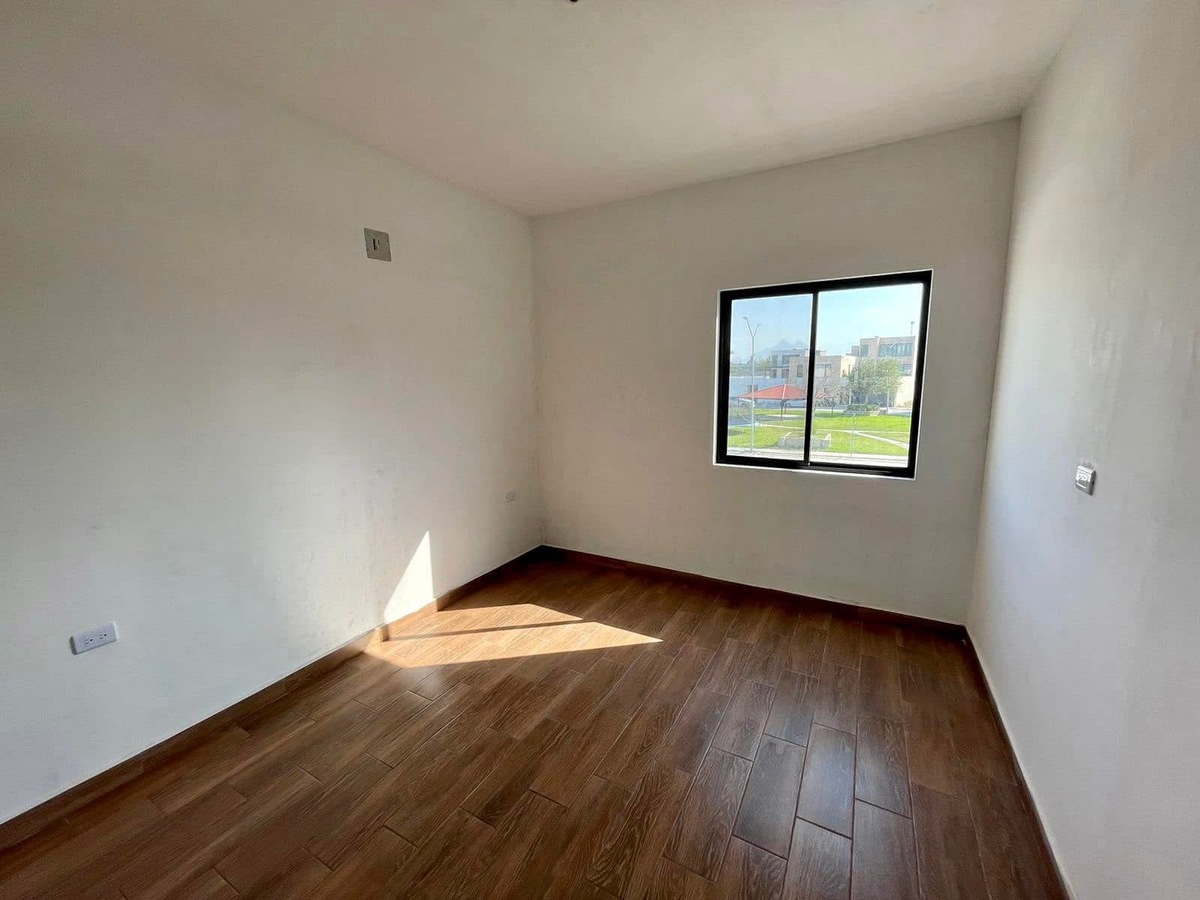Cochera doble, sala, comedor, 1/2 baño, cocina y lavandería.