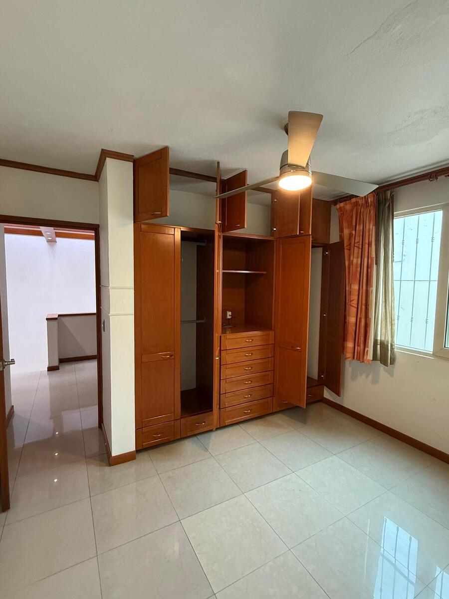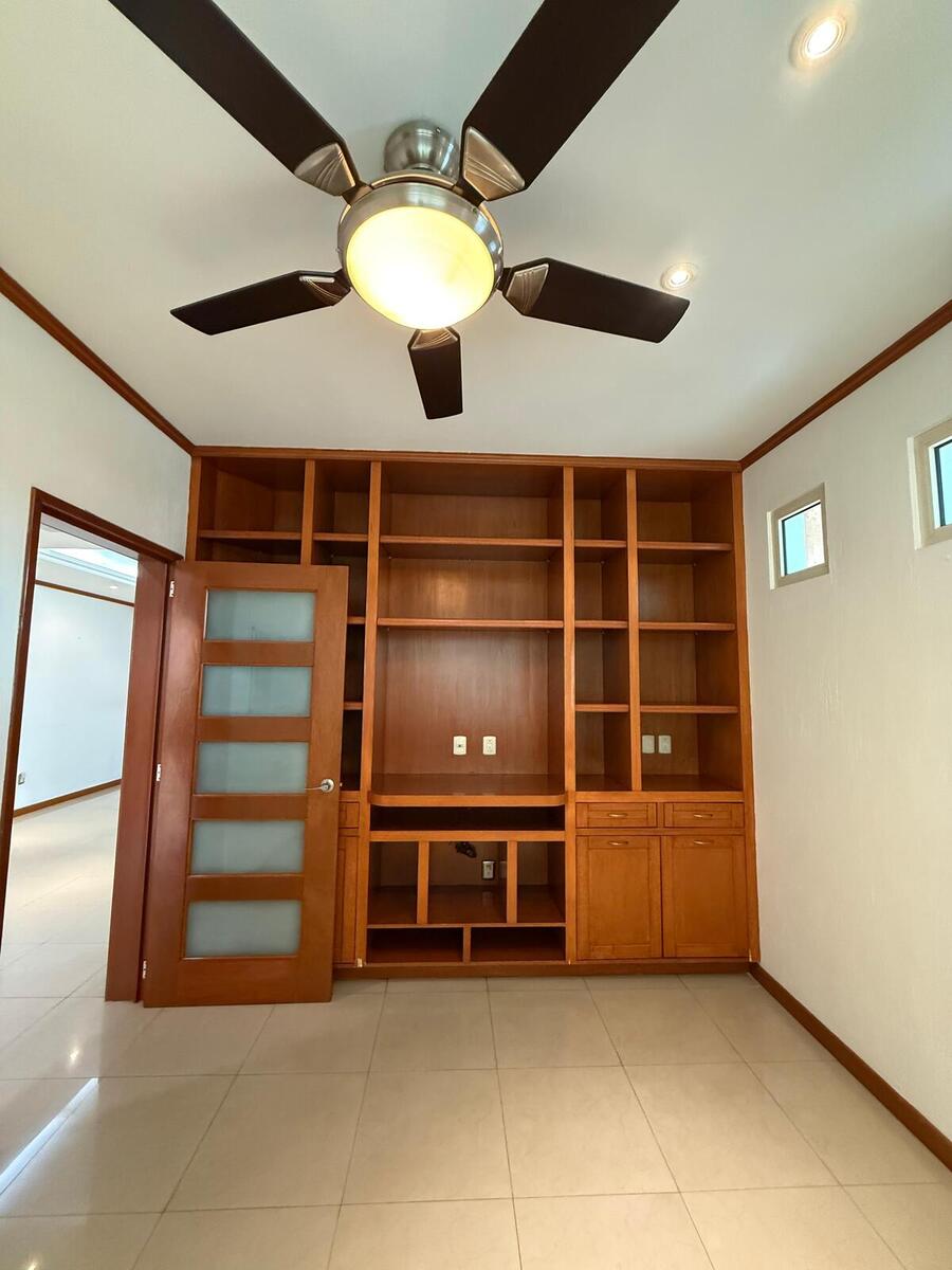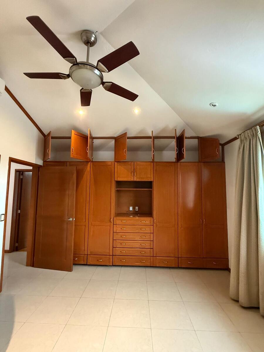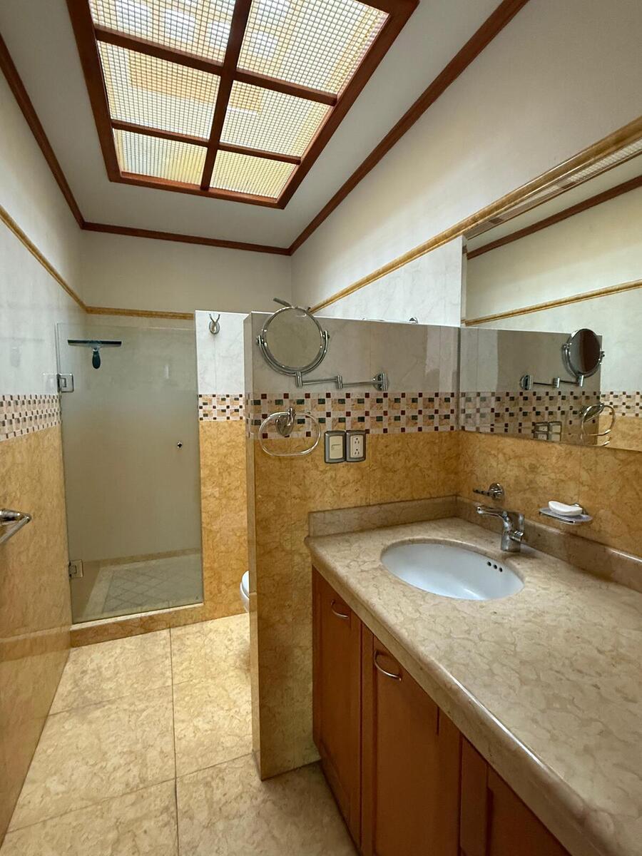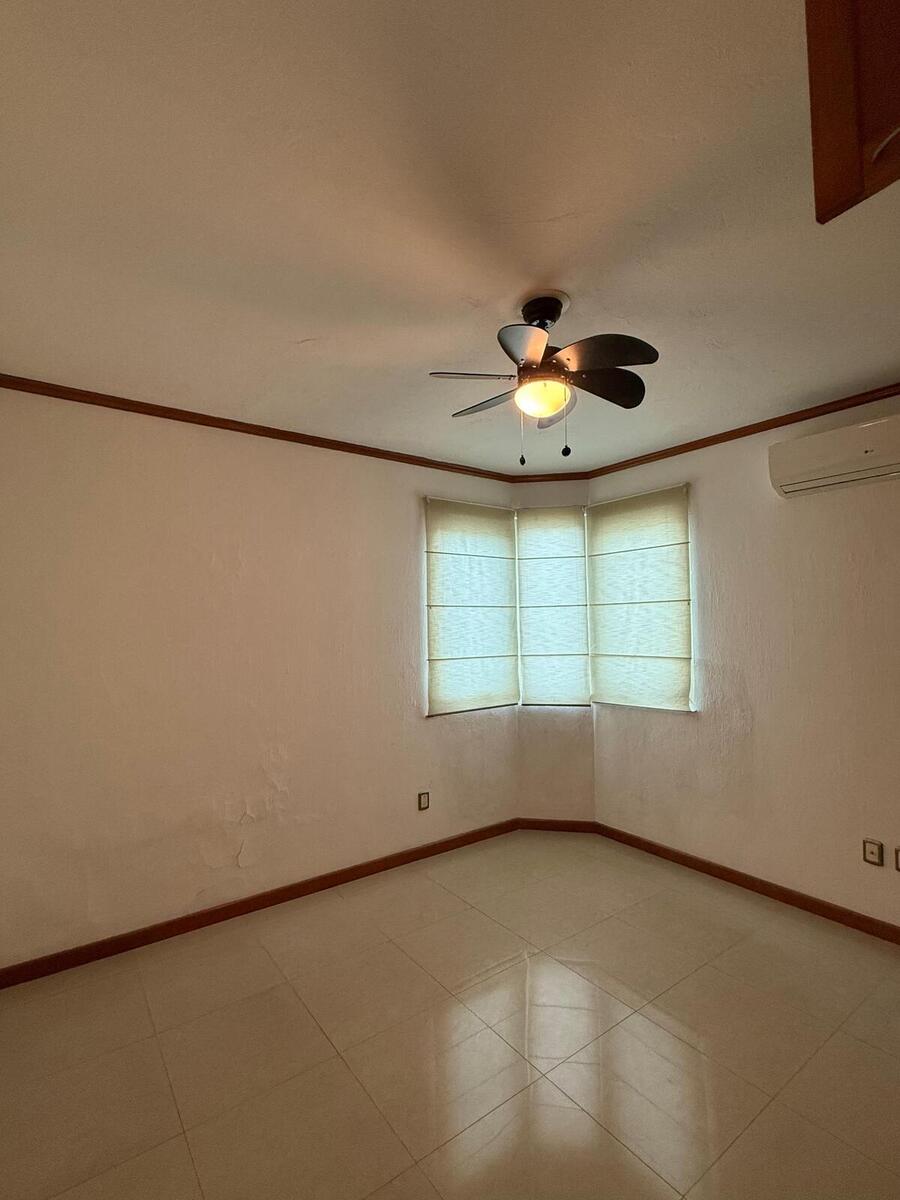 En planta alta hay 4 habitaciones cada una con closet, aire acondicionado y ventiladores, 3 baños completos, 2 para recamaras secundarias y 1 dentro de la recamara principal.