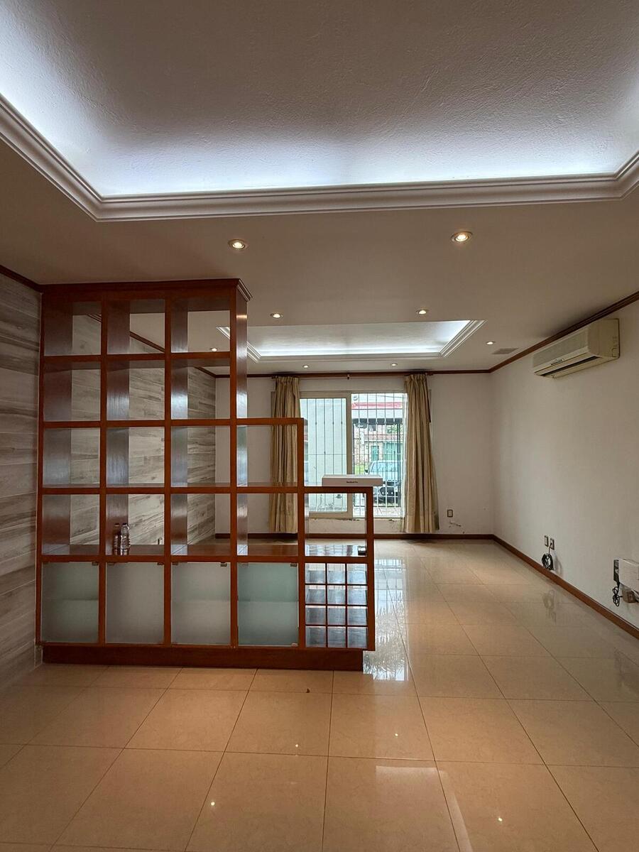 The ground floor consists of a foyer, living room, delineated by a wooden fixed partition that can be used as decoration or a bookshelf, half bathroom, and storage under the stairs.