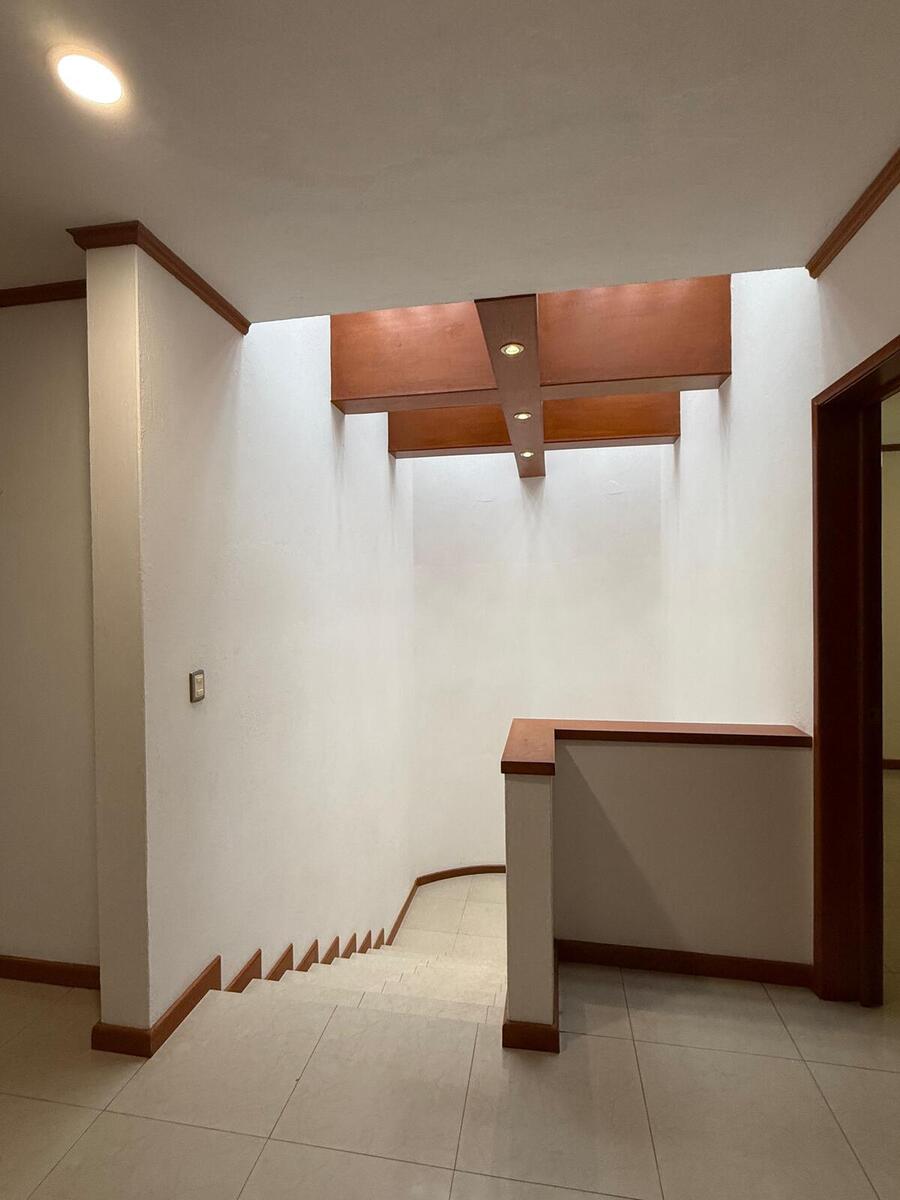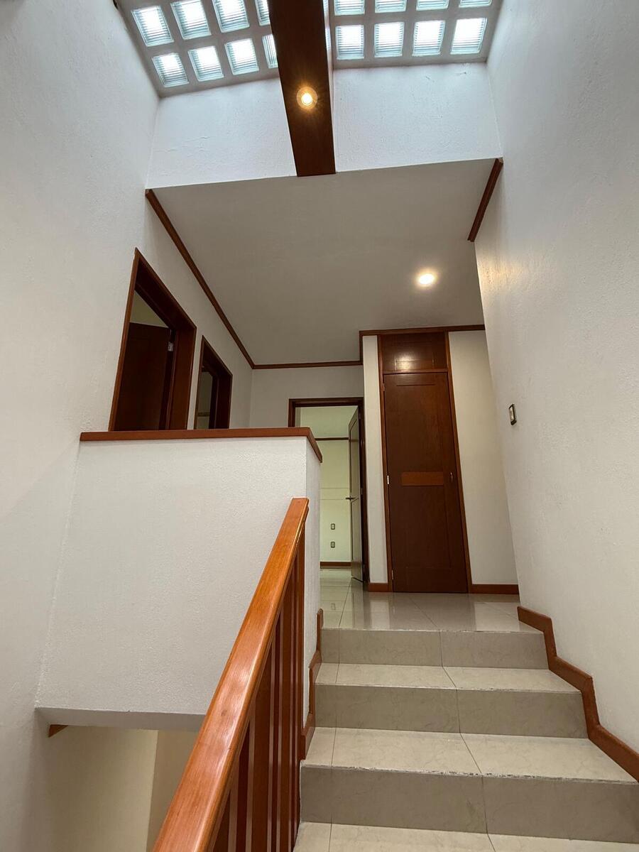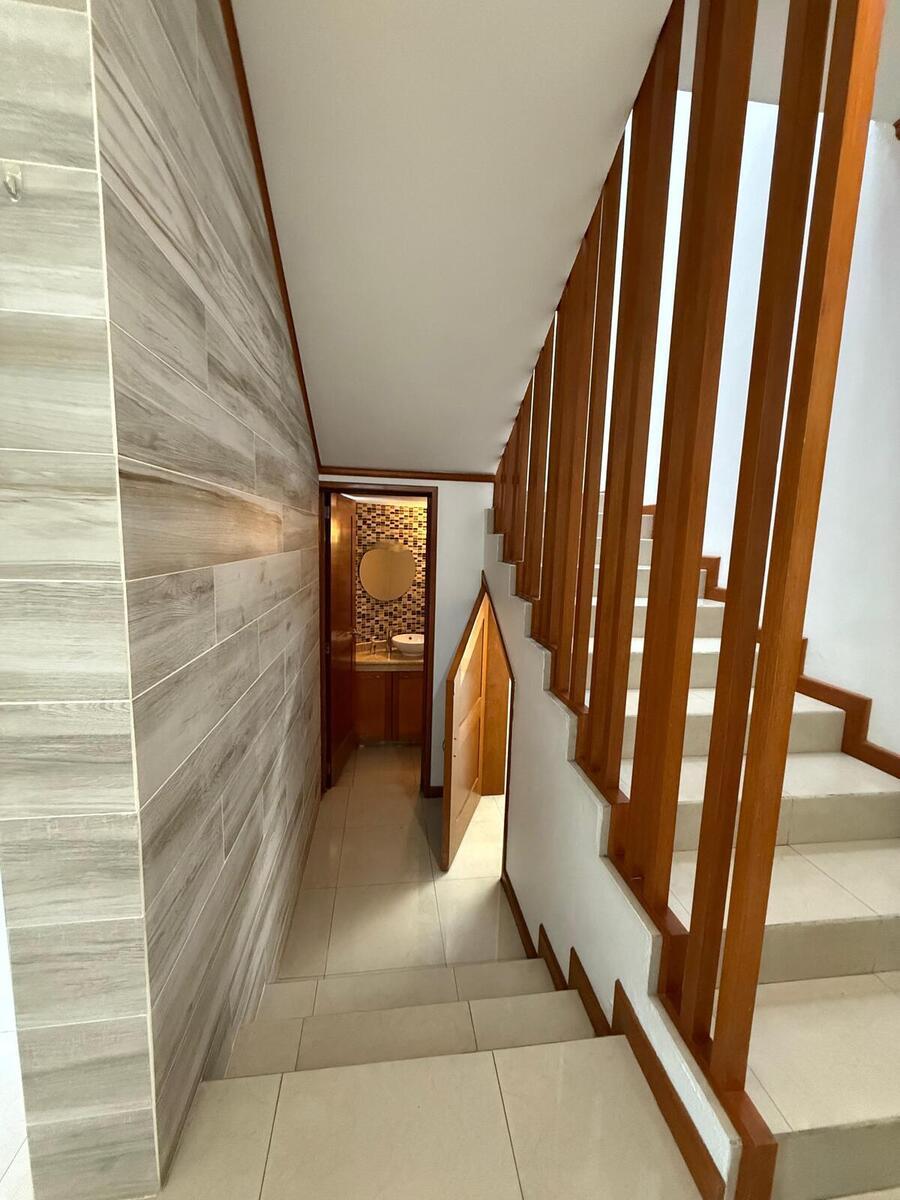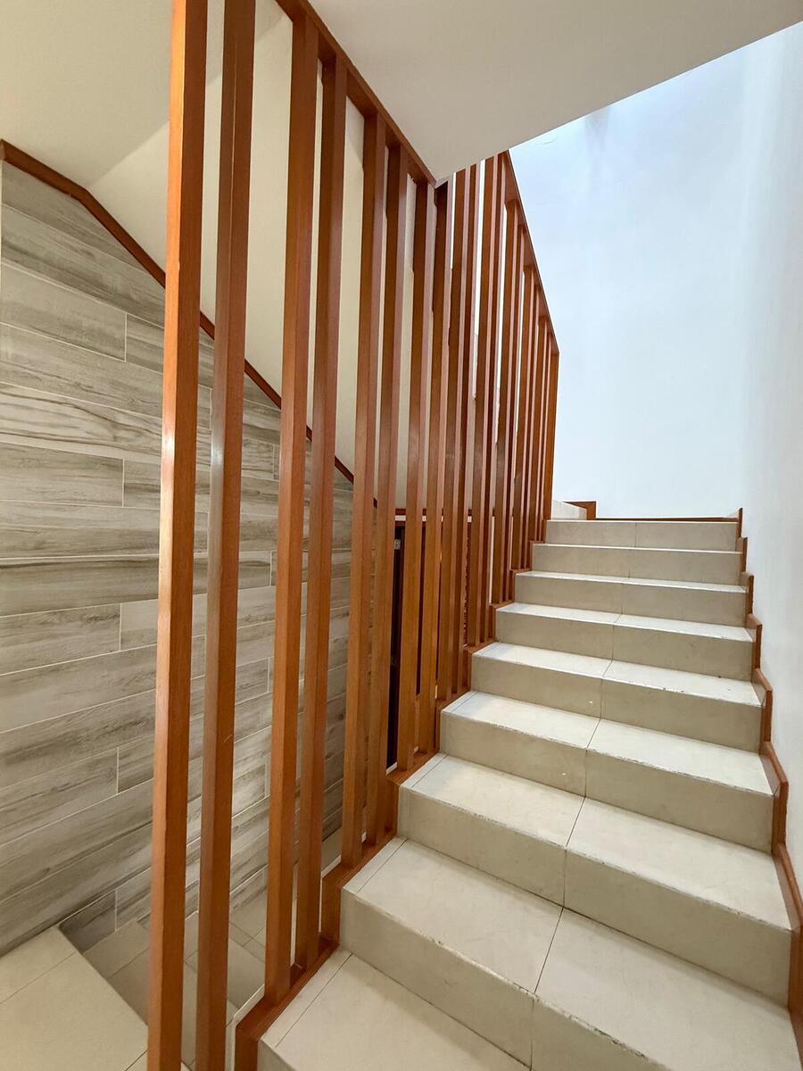 Las escaleras poseen un pasamanos escultórico en madera que brinda seguridad y elegancia, este espacio se encuentra iluminado por medio de un tragaluz con block de cristal que permiten un baño de luz natural.