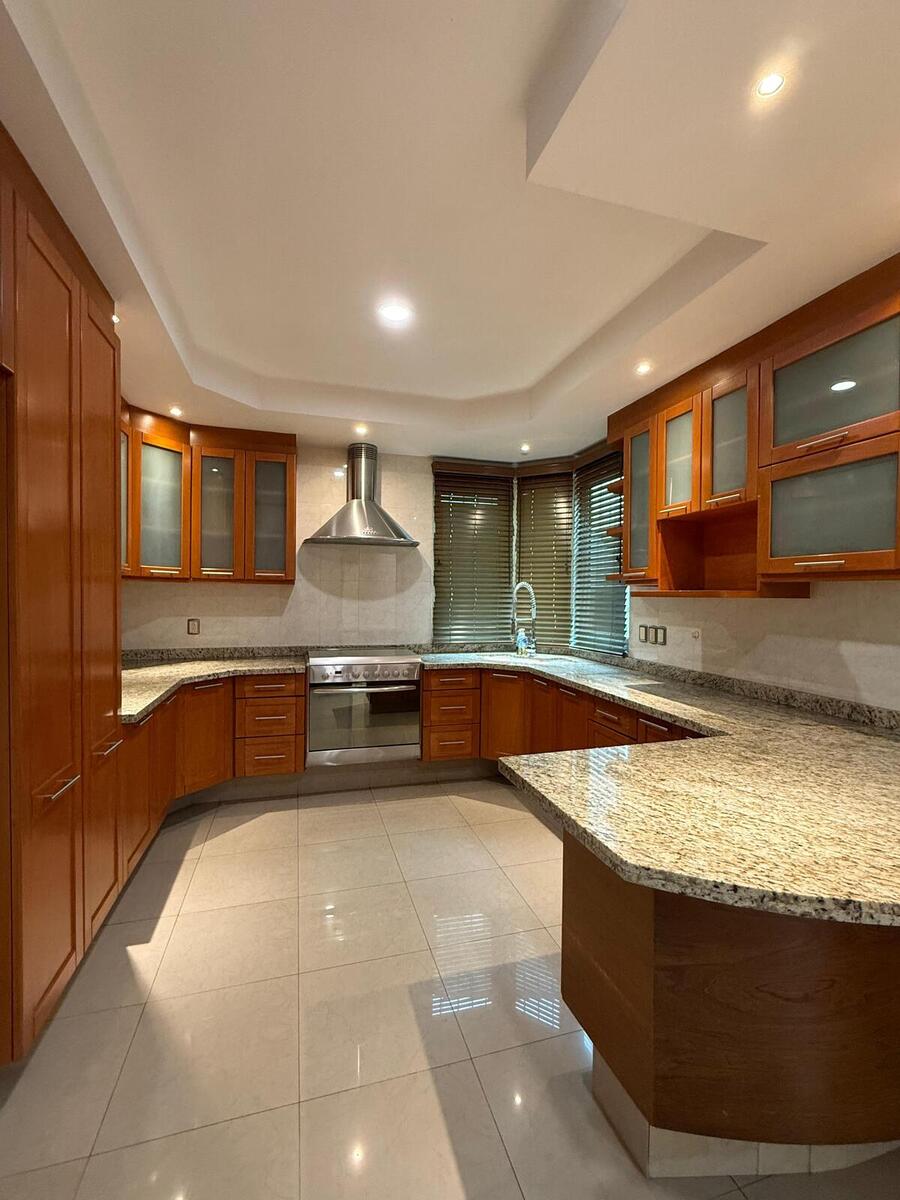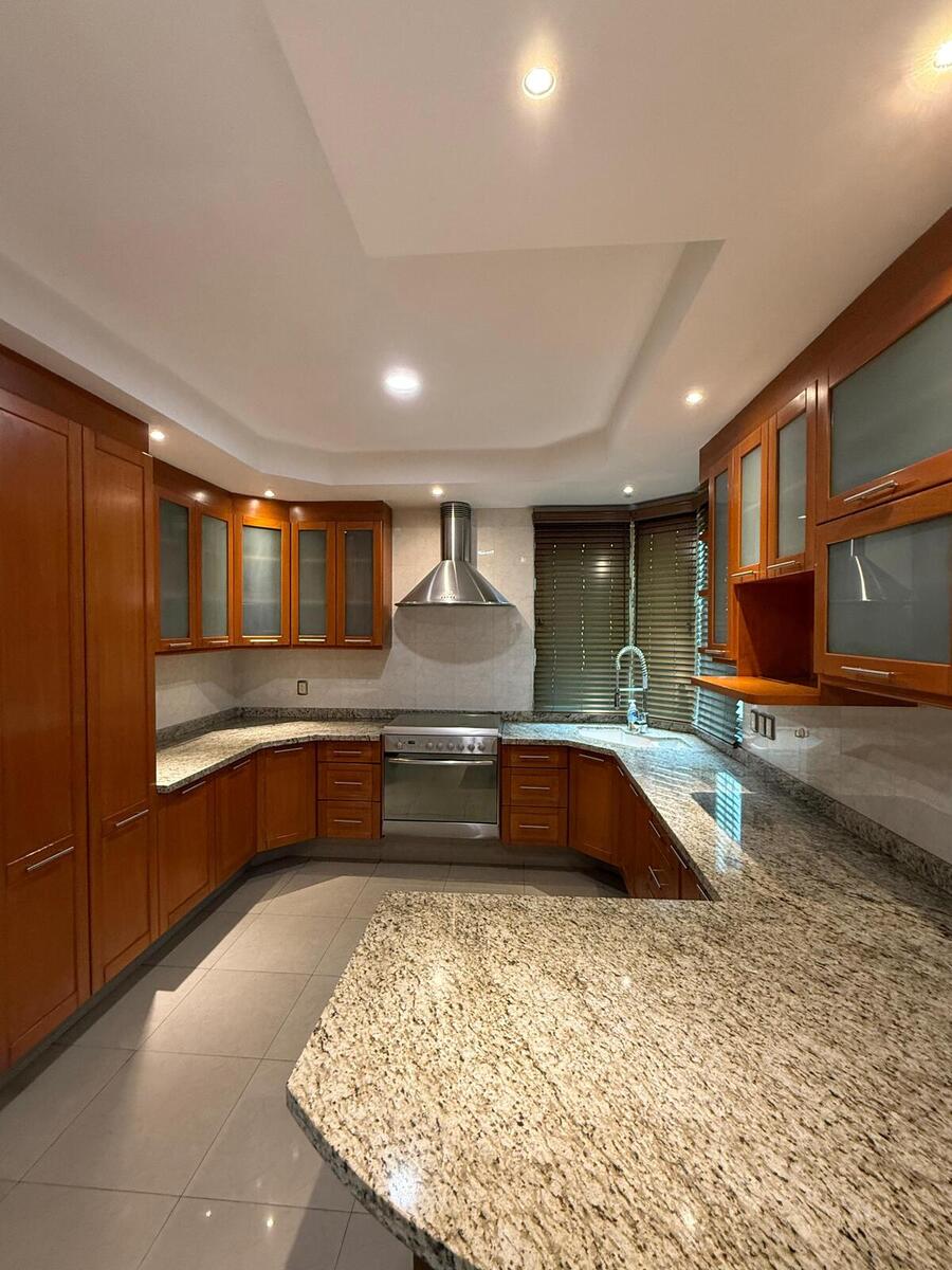The kitchen is equipped with a pantry, stainless steel sink, extractor hood, stove, and granite countertops as work surfaces, it connects with a semi-covered patio, this area has a sink, shelves for storage, and marine stairs to the roof.