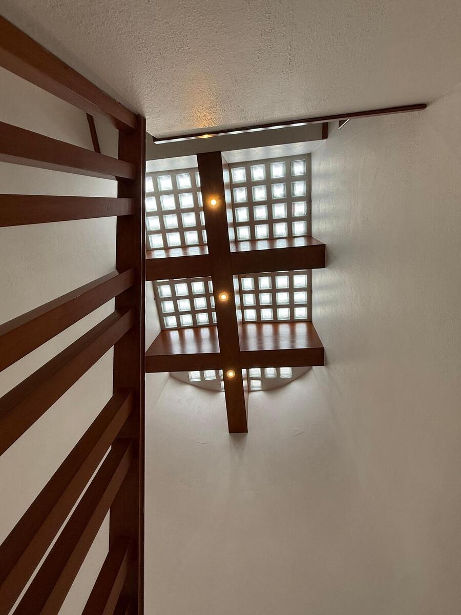 The stairs have a sculptural wooden handrail that provides safety and elegance, this space is illuminated by a skylight with glass block that allows a bath of natural light.