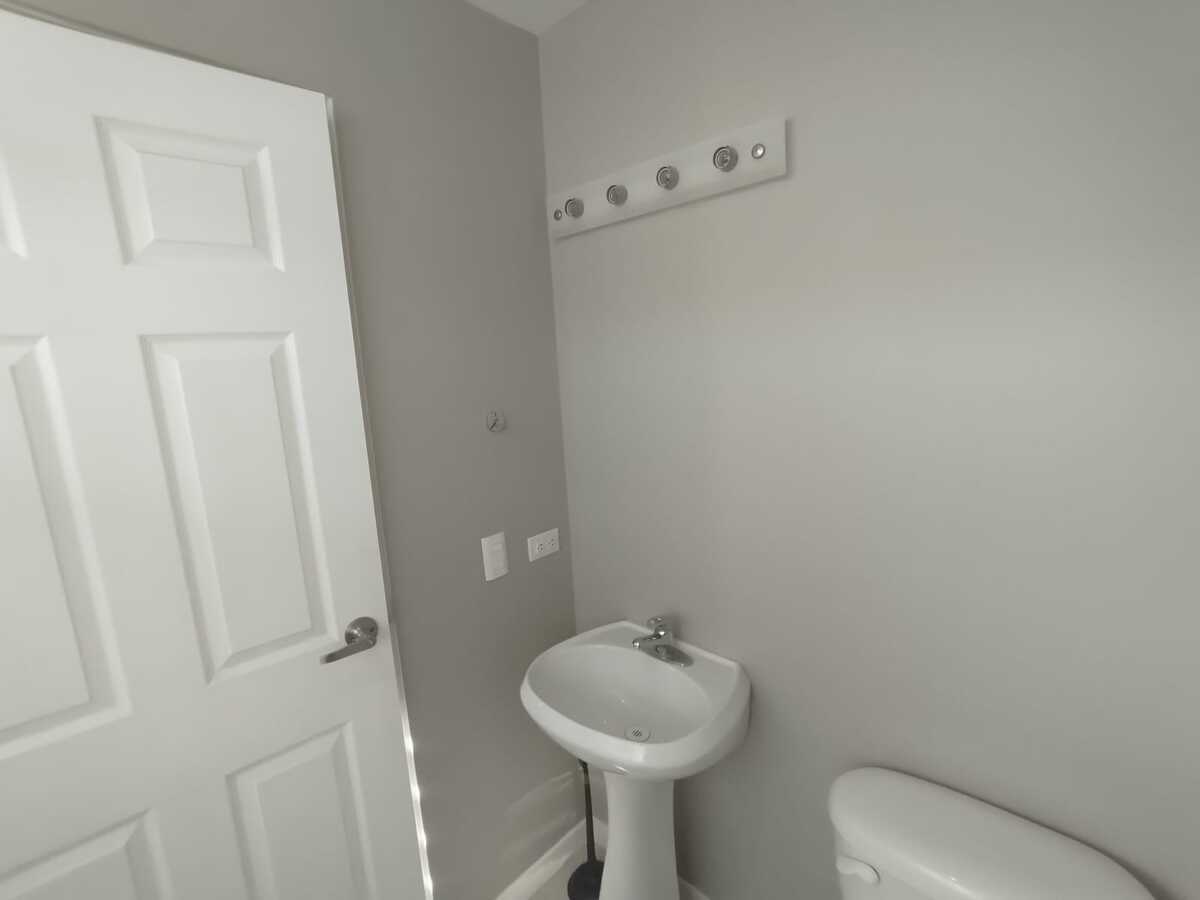 3 bedrooms, covered laundry room, living room on the upper floor, 2 and a half bathrooms, has a covered garage for two cars.