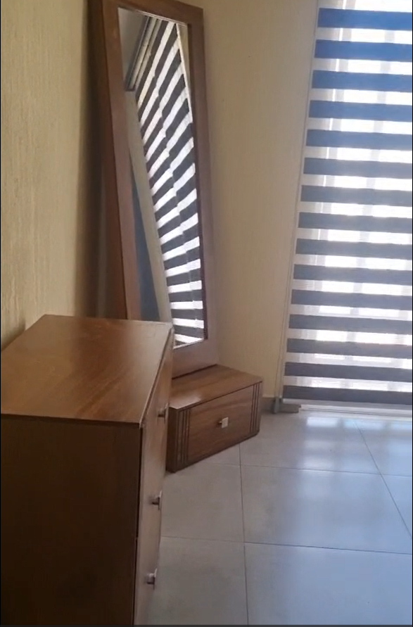 La casa cuenta con cochera para 2 autos, sala comedor para 4 personas, cocina integral con parrilla, gabinetes, refrigerador, patio o terraza, área de lavado con lavadora y lavadero, recámara y baño completo. En planta la recámara principal cuenta con cama, cabecera, 2 burós cómoda, persianas y clóset de muy buen tamaño.