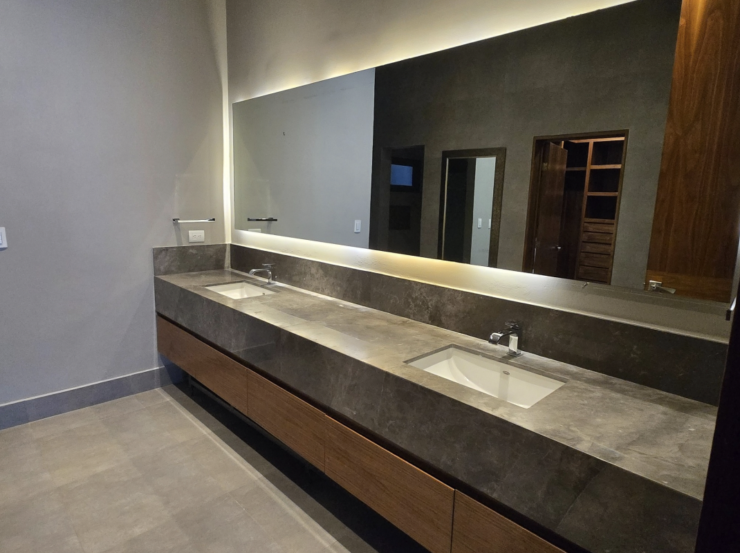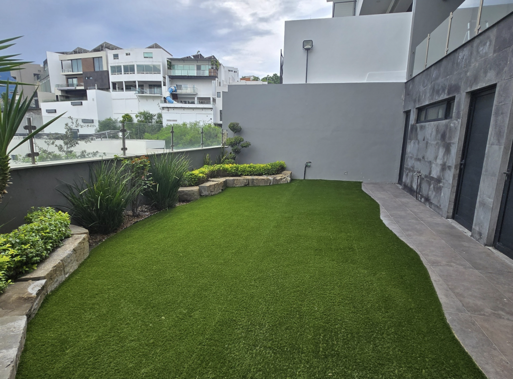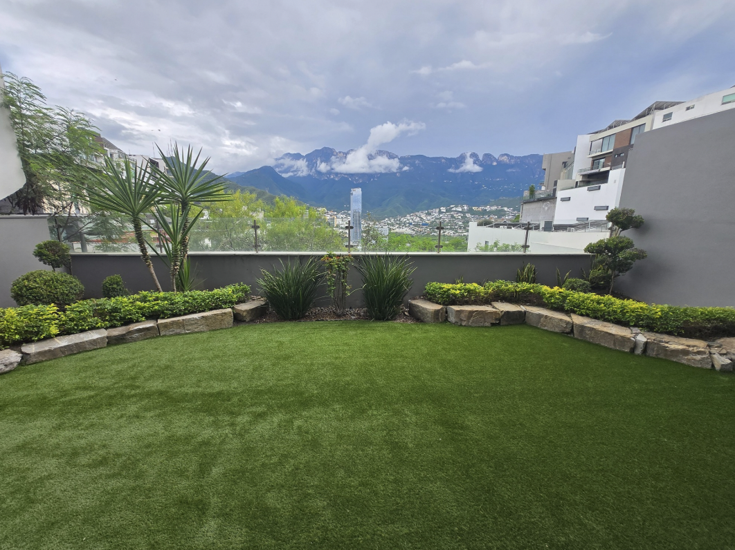 Espacios sociales amplios con sala, comedor y cocina integrada; recámara principal con vestidor, baño en mármol y patio privado; áreas familiares con cuarto de TV, estudio y recámaras secundarias. Jardín, patio y terraza con asador