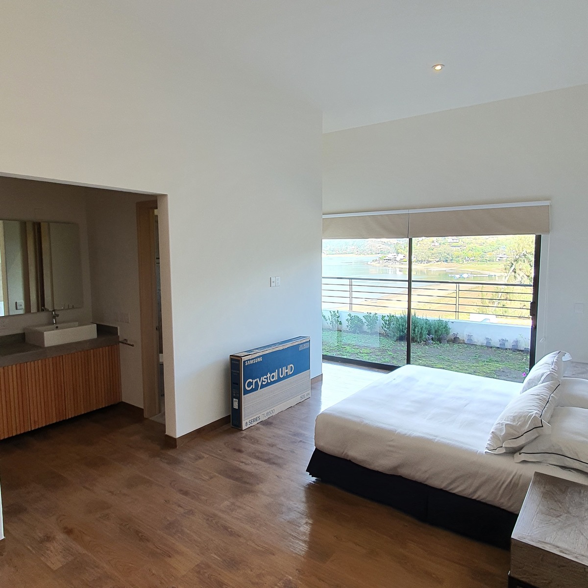 Salón TV con doble altura y vista al lago