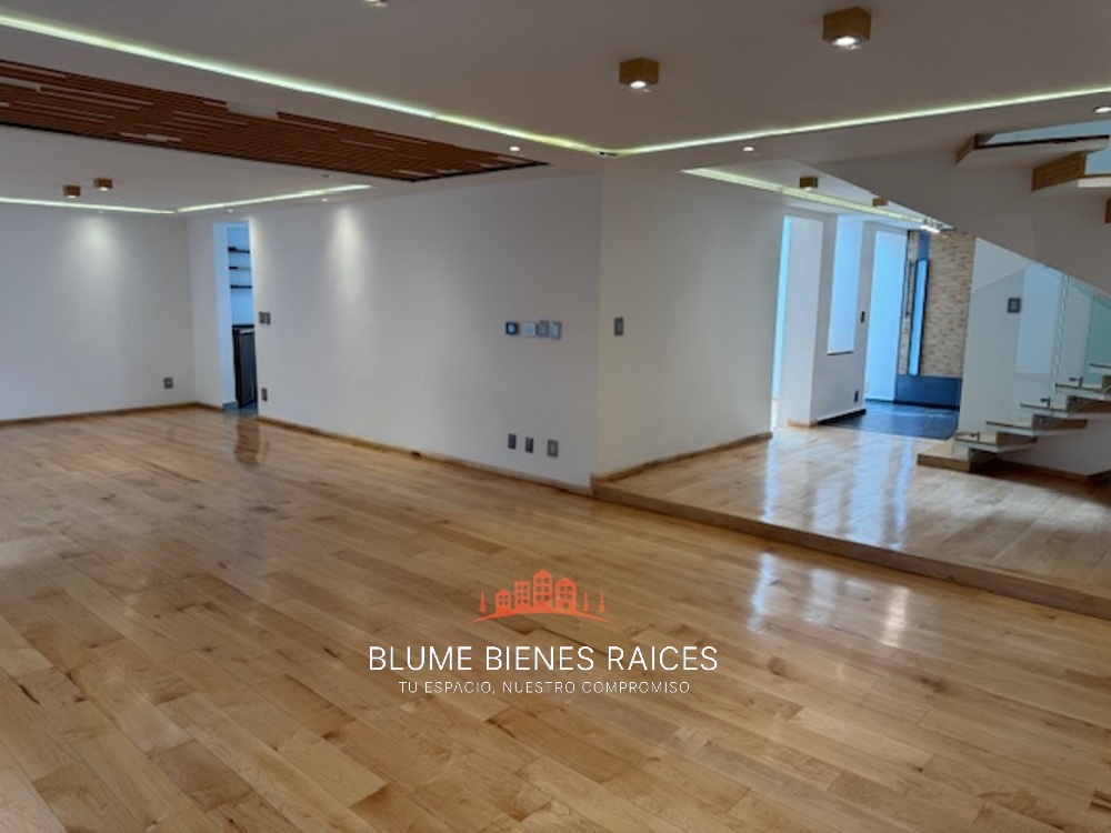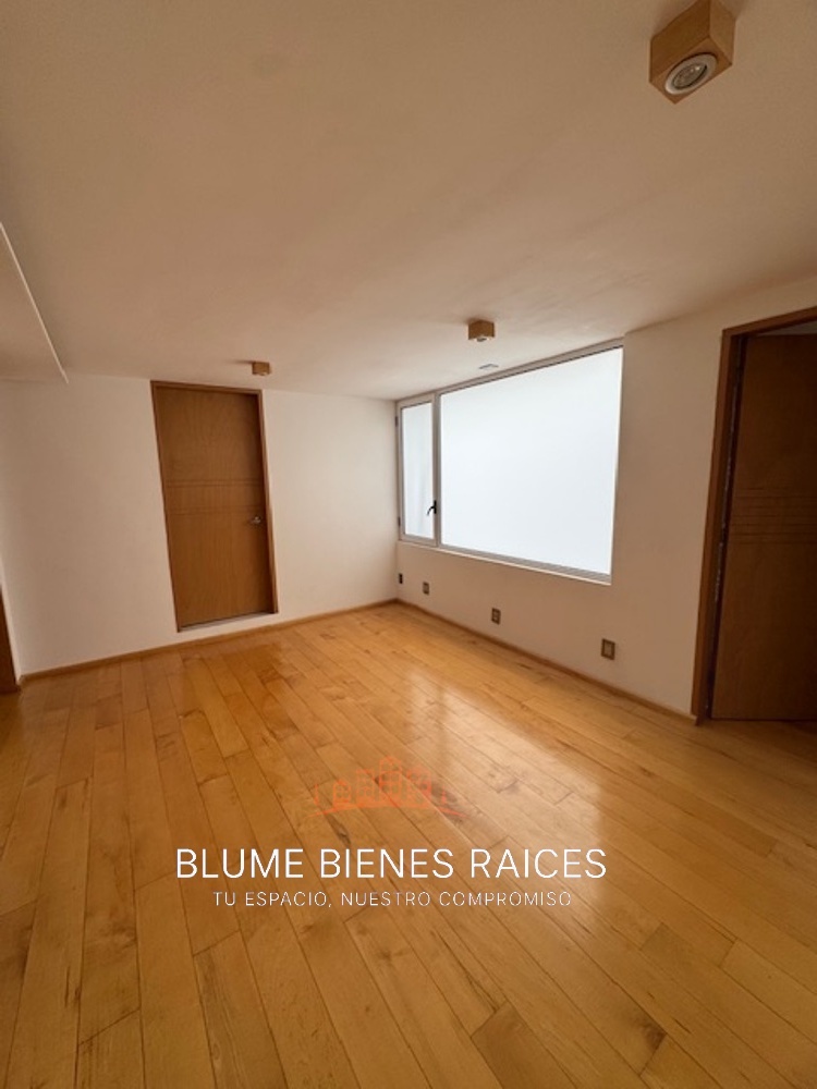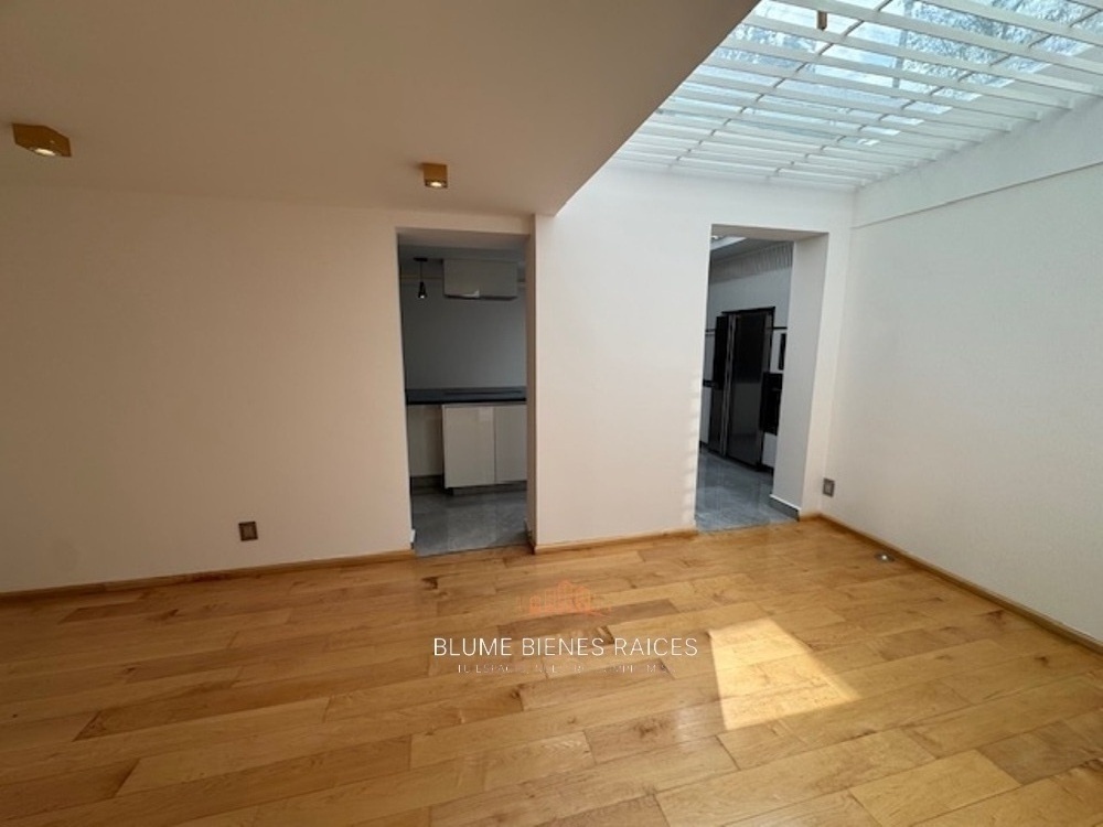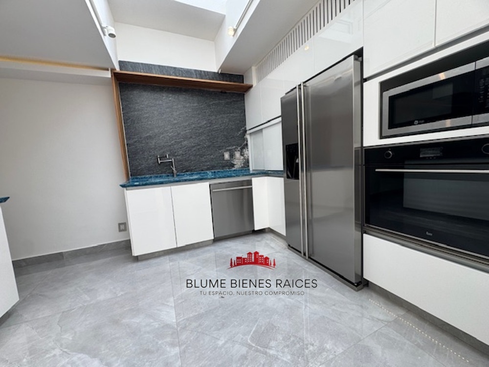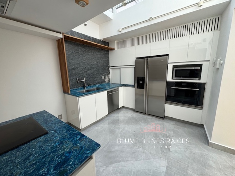 PB: Se ubica la amplia estancia con chimenea, para crear diferentes ambientes, los ventanales de piso a techo y sus puertas corredizas te permiten que se integre a una amplia terraza de 80 m2 con jacuzzi, para vivir momentos únicos además se conecta por la parte de atrás directamente a bosque de Chapultepec. La cocina es semiabierta totalmente equipada con electrodomésticos de buena calidad (refrigerador, horno de microondas, lavavajillas), se conecta tanto a la estancia como a un desayunador y con domo que baña de espléndida luz esta área. Asimismo, en este nivel encontramos medio baño de visitas, área de lavado, baño completo de servicio; además de dos lugares de estacionamiento techados.