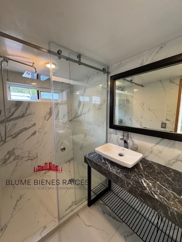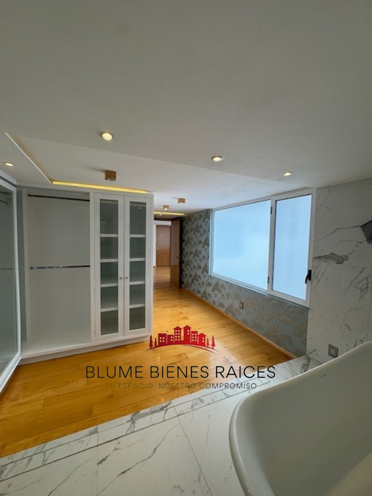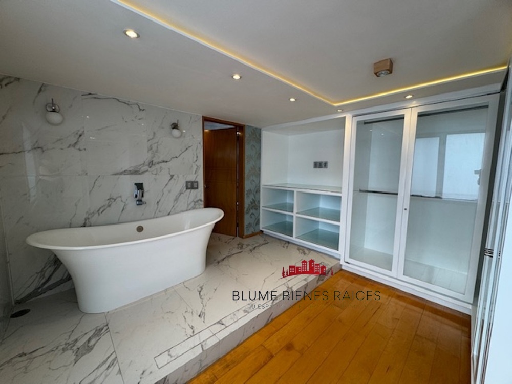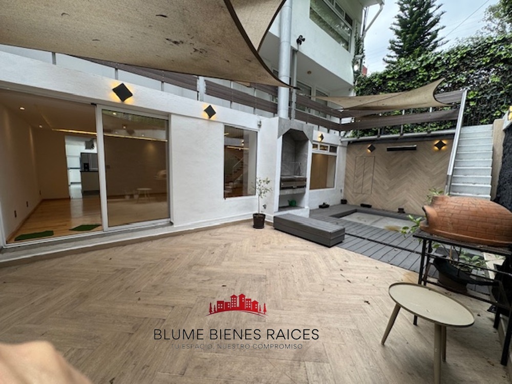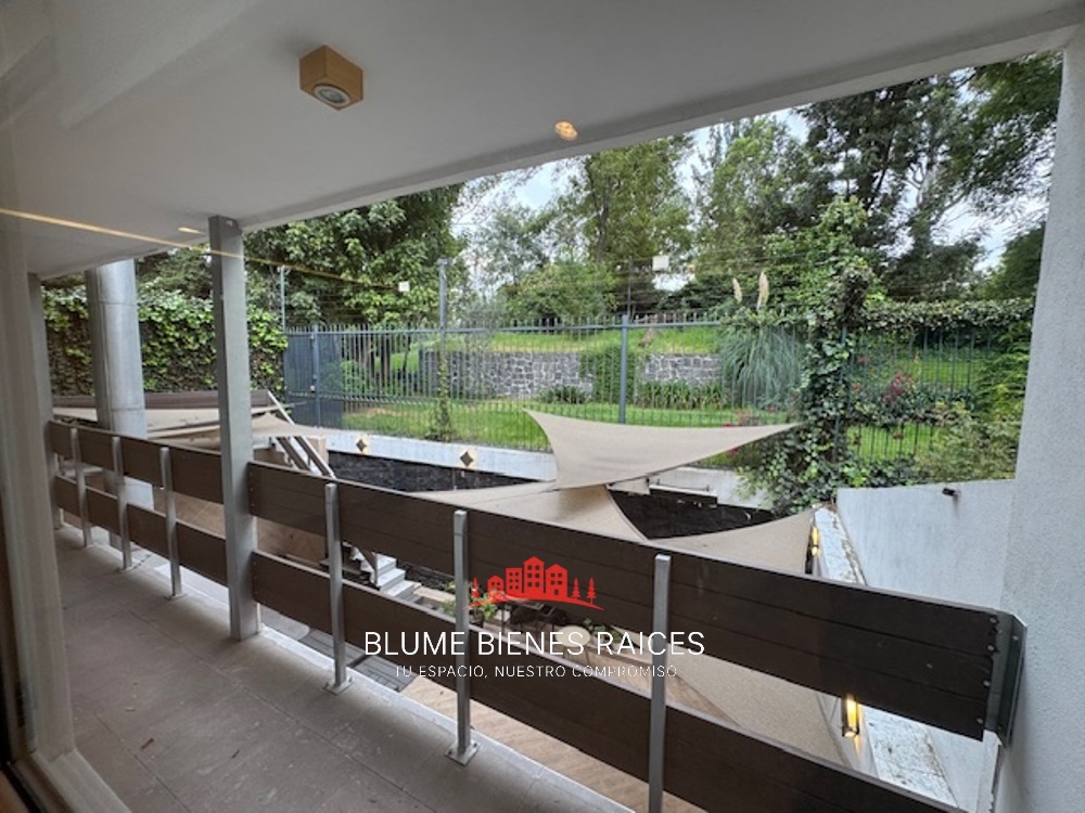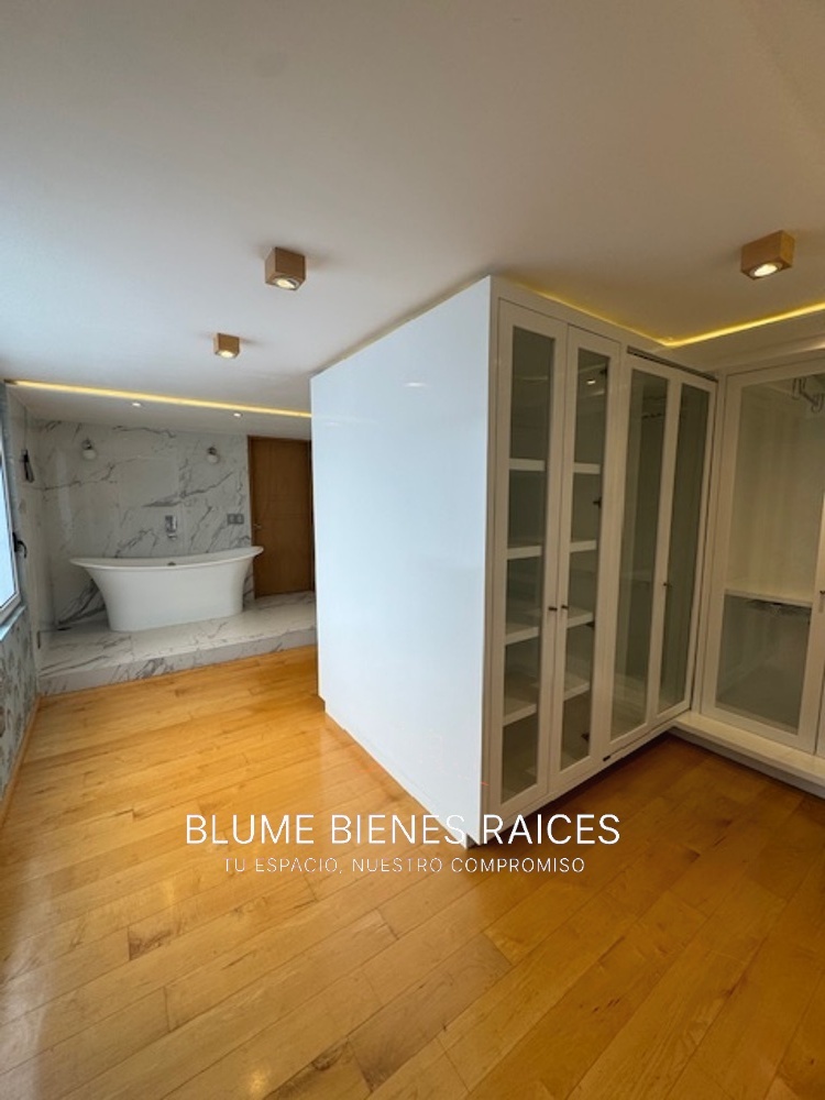 PB: Se ubica la amplia estancia con chimenea, para crear diferentes ambientes, los ventanales de piso a techo y sus puertas corredizas te permiten que se integre a una amplia terraza de 80 m2 con jacuzzi, para vivir momentos únicos además se conecta por la parte de atrás directamente a bosque de Chapultepec. La cocina es semiabierta totalmente equipada con electrodomésticos de buena calidad (refrigerador, horno de microondas, lavavajillas), se conecta tanto a la estancia como a un desayunador y con domo que baña de espléndida luz esta área. Asimismo, en este nivel encontramos medio baño de visitas, área de lavado, baño completo de servicio; además de dos lugares de estacionamiento techados.