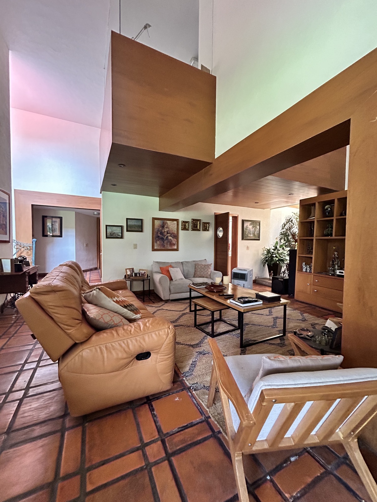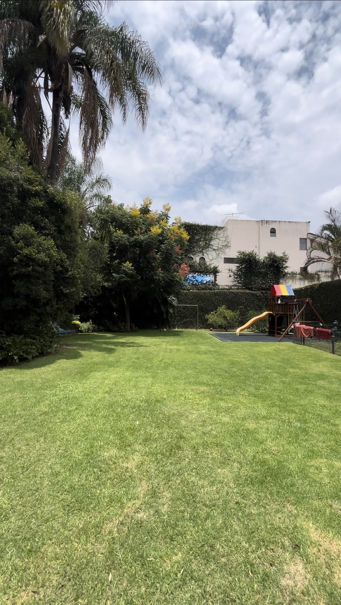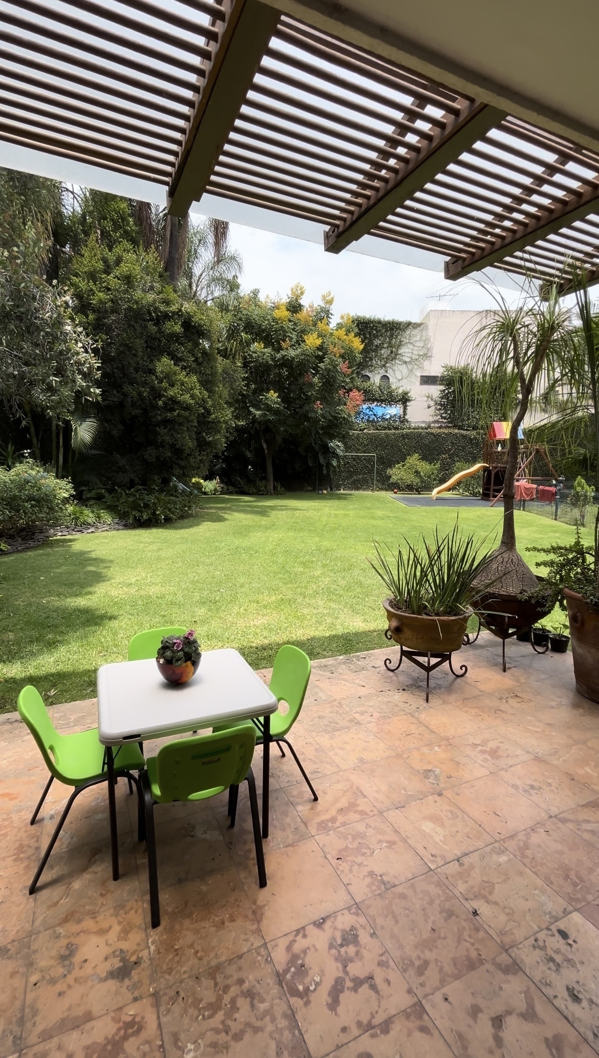 Tiene 980 mt (55x 18) de terreno y 460 const tiene cochera 5 autos, portero eléctrico, estudio en mezzanine, prácticamente está toda en planta baja, cuenta con 3 Recámaras, cada una con su baño y vestidor, estar de TV, cuarto de juegos para los niños, sala comedor, cocina integral con desayunador, cuarto y área de servicio, una terraza muy grande techada, con juegos para niños, asador, huerto de vegetales y un. Jardín muy amplio.