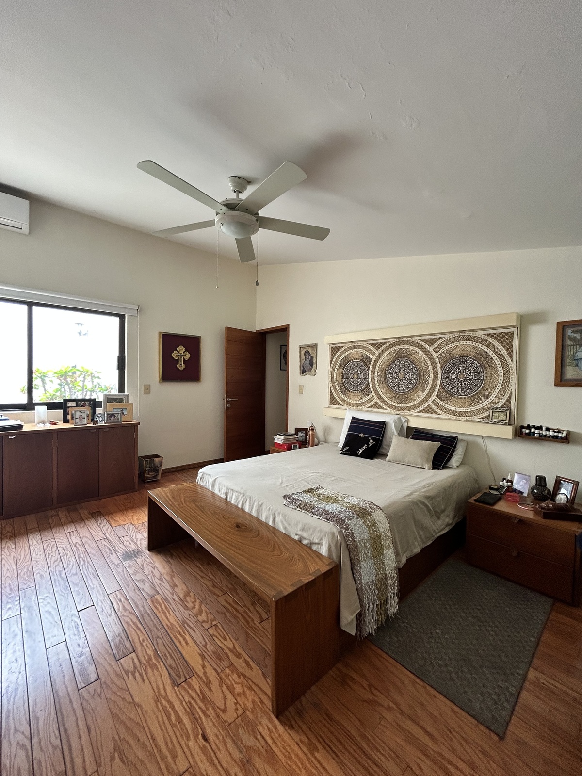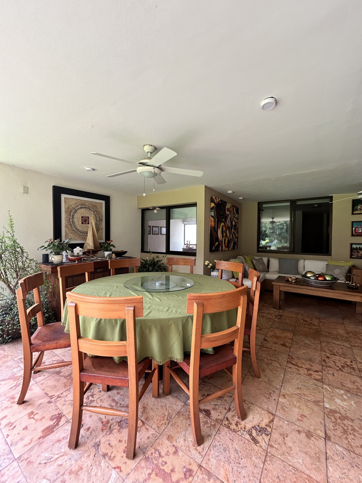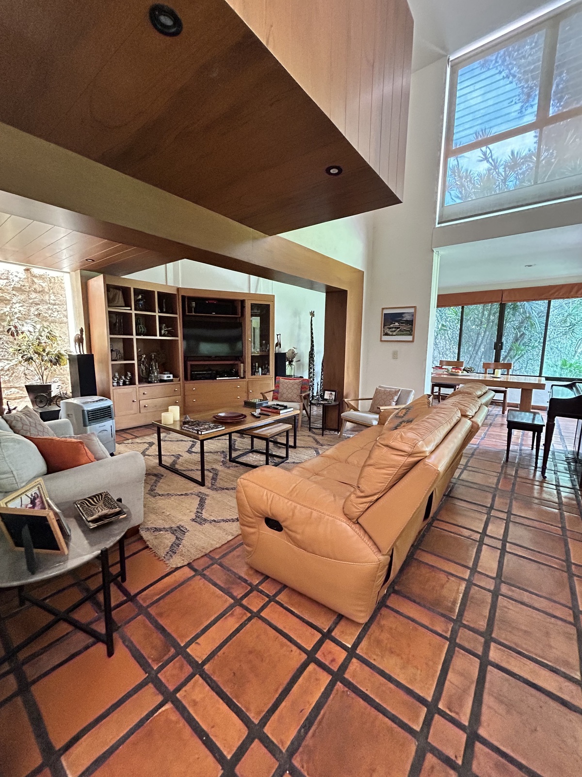Tiene 980 mt (55x 18) de terreno y 460 const tiene cochera 5 autos, portero eléctrico, estudio en mezzanine, prácticamente está toda en planta baja, cuenta con 3 Recámaras, cada una con su baño y vestidor, estar de TV, cuarto de juegos para los niños, sala comedor, cocina integral con desayunador, cuarto y área de servicio, una terraza muy grande techada, con juegos para niños, asador, huerto de vegetales y un. Jardín muy amplio.