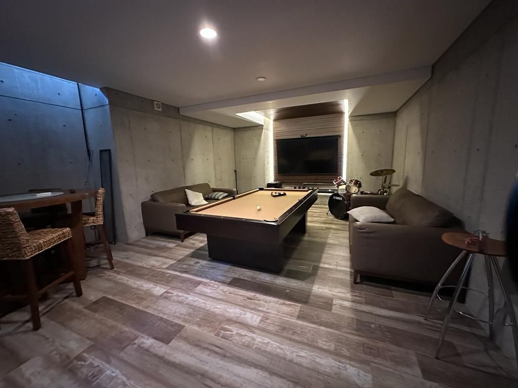 Increíble cuarto de juegos con TV y mesa de billar.