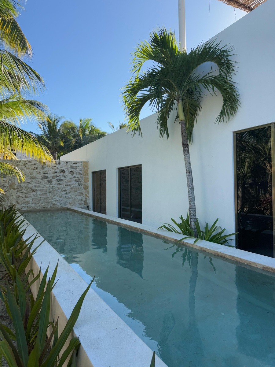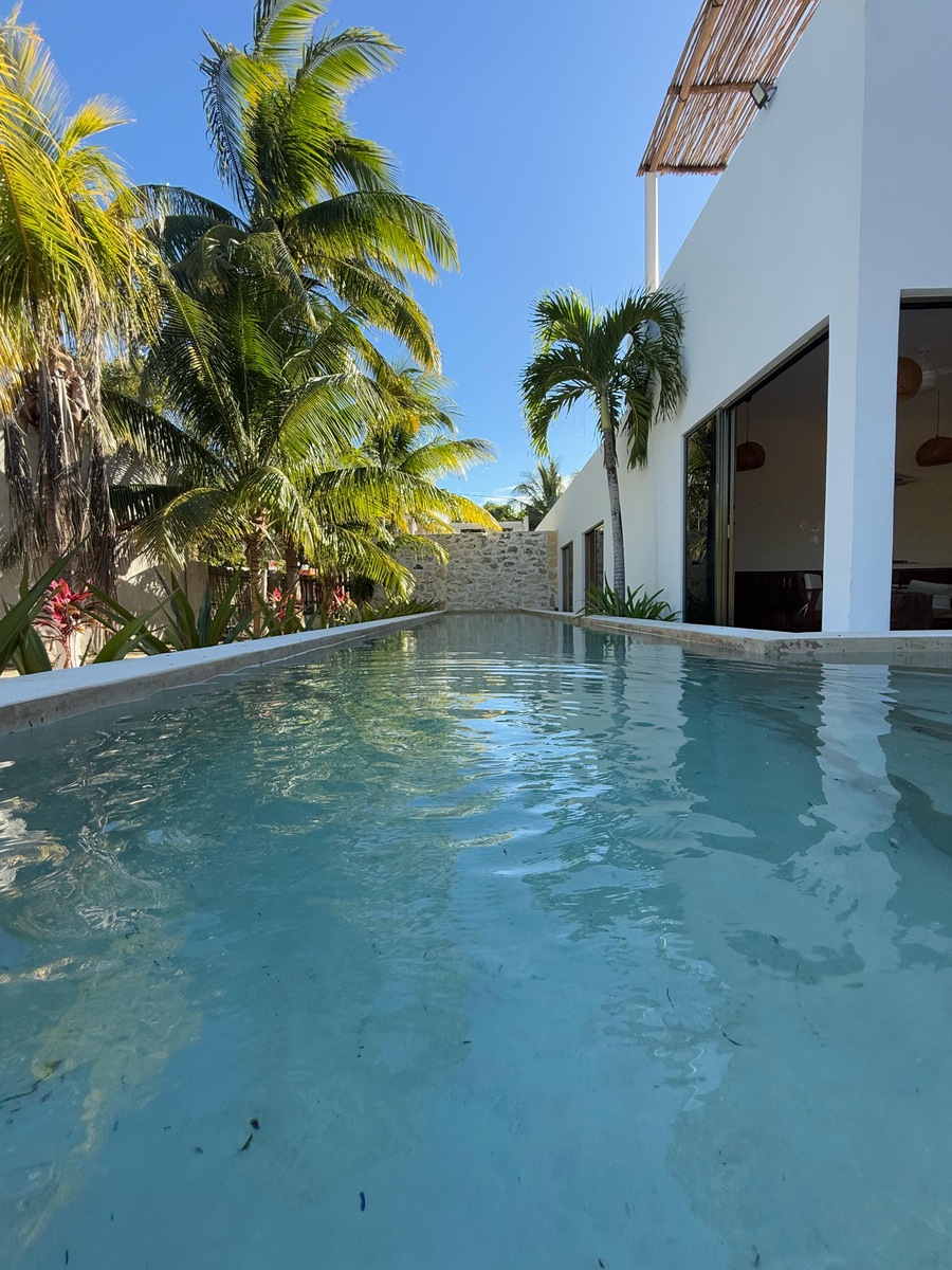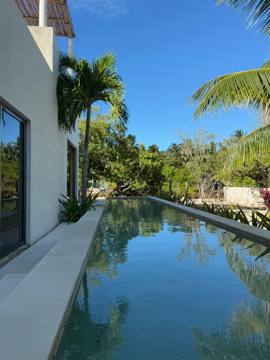 La alberca en forma de L que rodea la m propiedad y esta diseñado como un carril de nado y también un área de descanso tipo jacuzzi.