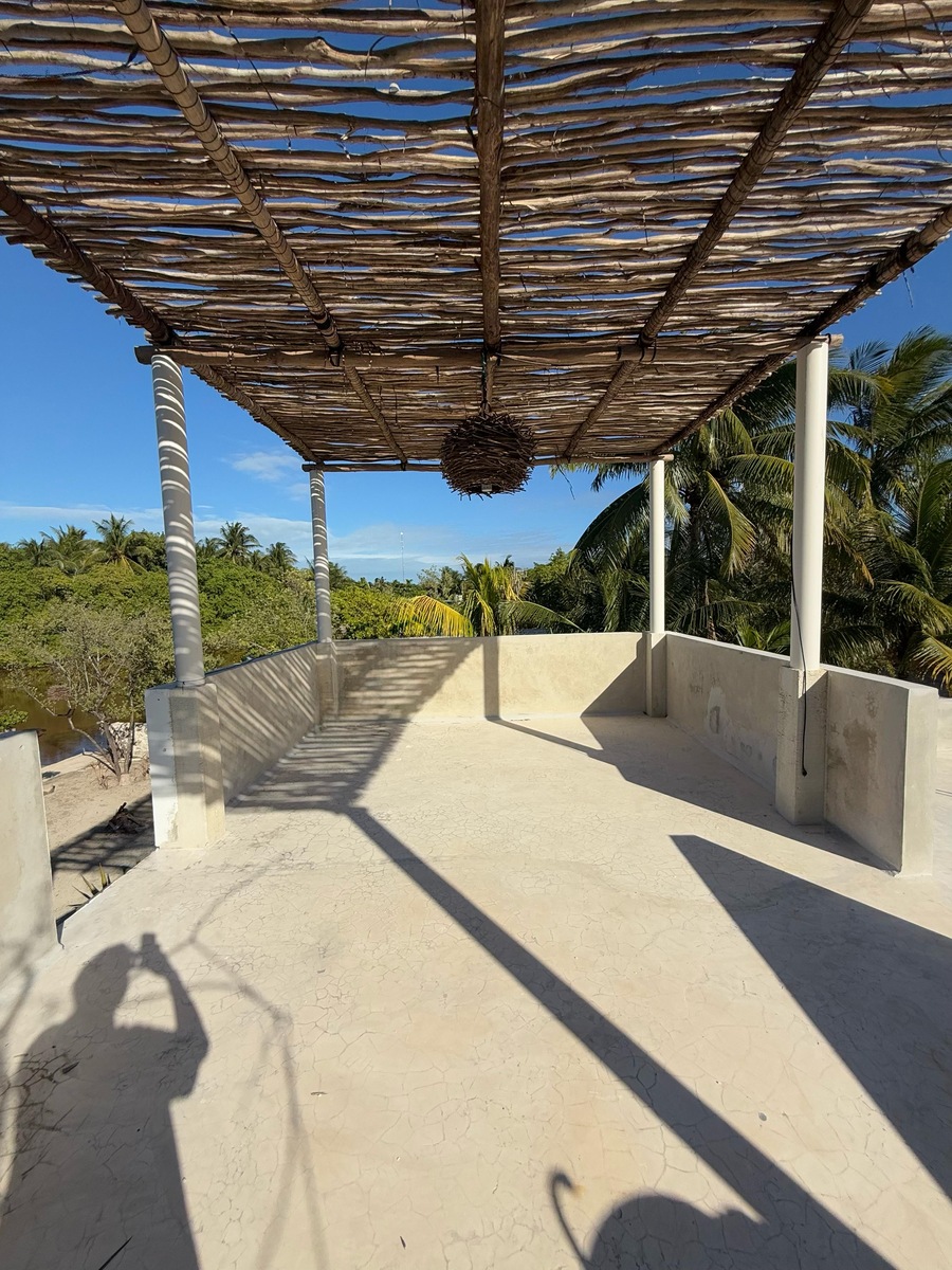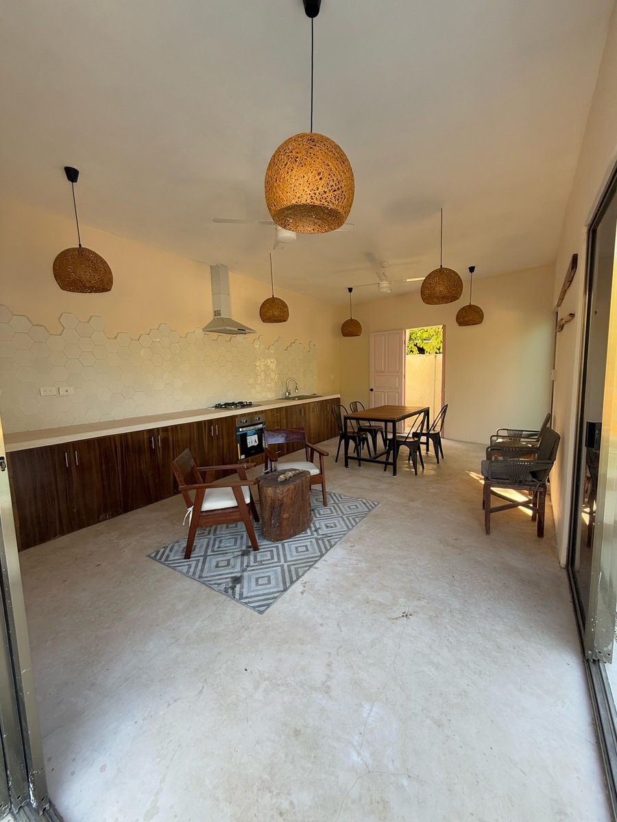 Above the kitchen, there is a covered rooftop with bajareque that serves as an outdoor living room.