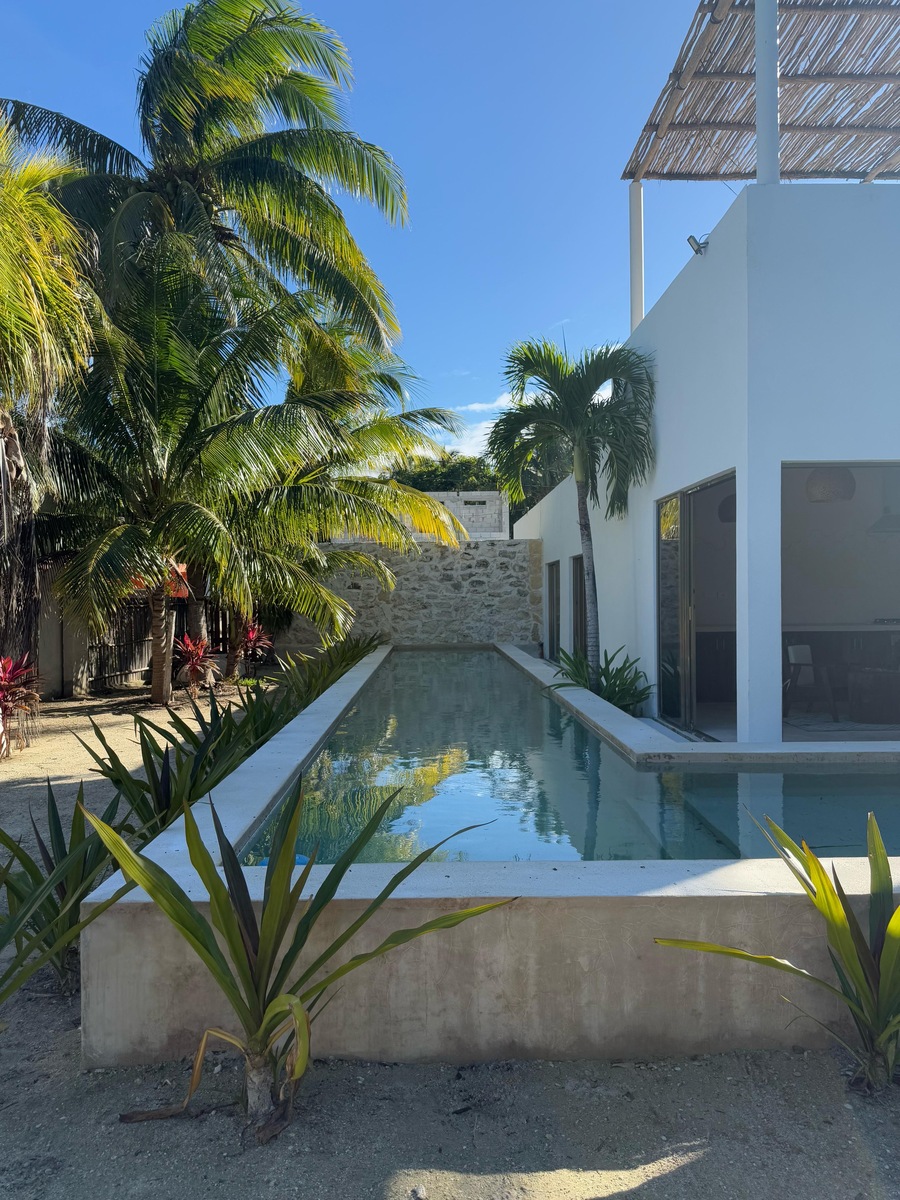 The L-shaped pool surrounds the property and is designed as a swimming lane and also a jacuzzi-style resting area.