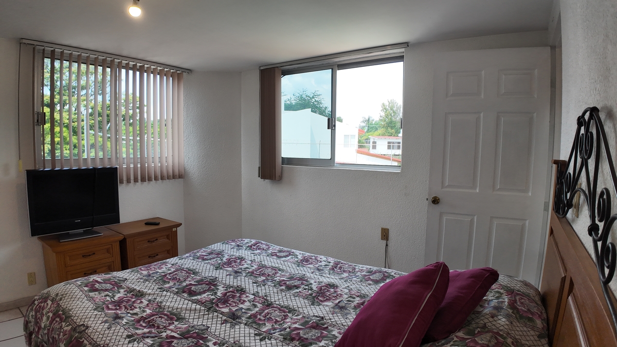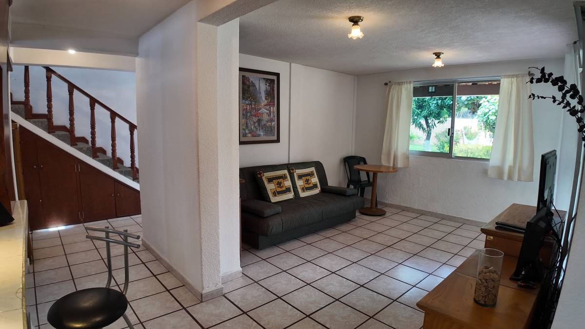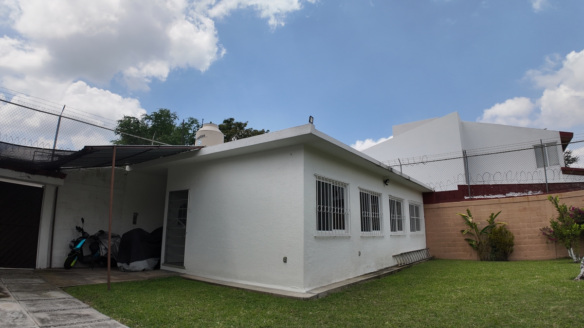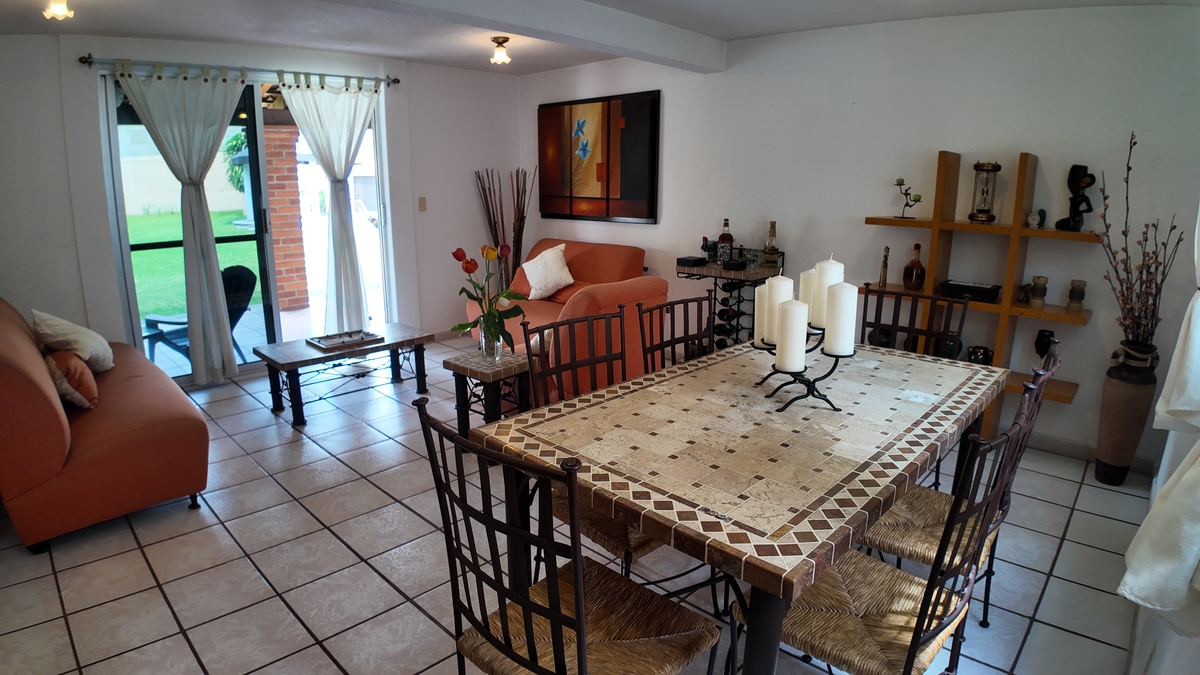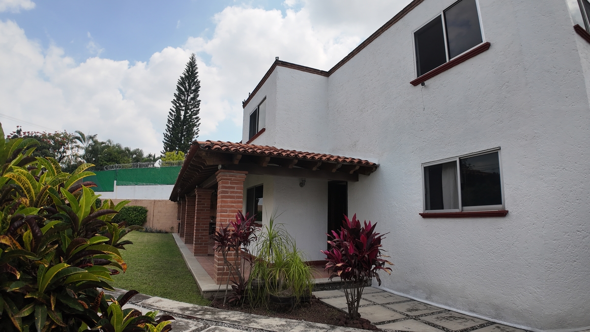 Nice Cuernavaca style house, with 3 bedrooms, the main one has a bathroom, all on the second level, living room and dining room, study, semi-equipped kitchen with a bar and door leading to the service area. Very large covered terrace with a grill overlooking the pool, 6 uncovered parking spaces, bungalow of approx. 50m2 with bathroom.