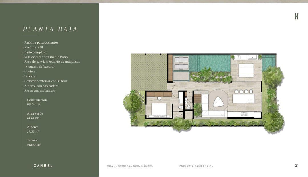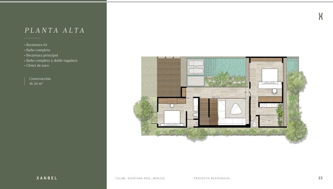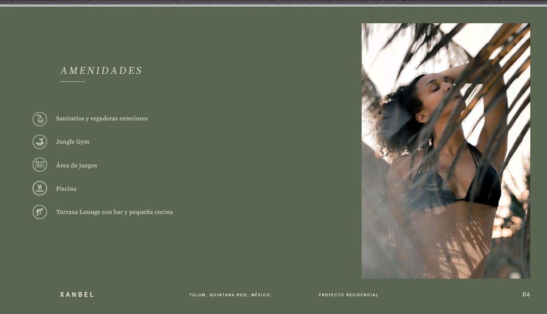 Xanbel is a project of fully equipped houses with luxury amenities located in the most exclusive area of Tulum. Selvazama is a modern area, with paved streets, a beach a short bike ride away, drainage, black water treatment, electricity, and everything you need to live in nature without giving up comfort. In Selvazama, you will find the Green School: a school with an educational model that will attract families from all over the world looking to share a lifestyle in harmony with the planet. Xanbel invites you to take the time to live slowly and consciously. The idea is to inhabit the world calmly, at a pace that follows that of nature. The space was designed to accommodate a lifestyle that reflects peace, harmony, and tranquility without neglecting sobriety and elegance. Xanbel is for families looking to live sustainably, care about the future of the planet, and want their children to grow up in a conscious, safe, and multicultural environment. We have extensive green areas, a restaurant, jungle gym, natural rock pool, mini-golf, organic garden, and many other amenities. Tulum has become one of the best places to invest in Mexico, with low risk and assured appreciation. People from all over the world are making this their home, not only for the economic growth and the intangible value of its beauty but also for the quality of life it offers. X A N B E L means space in Mayan. It refers to slow living, to escape from routine to connect with nature.Xanbel es un proyecto de casas totalmente equipadas