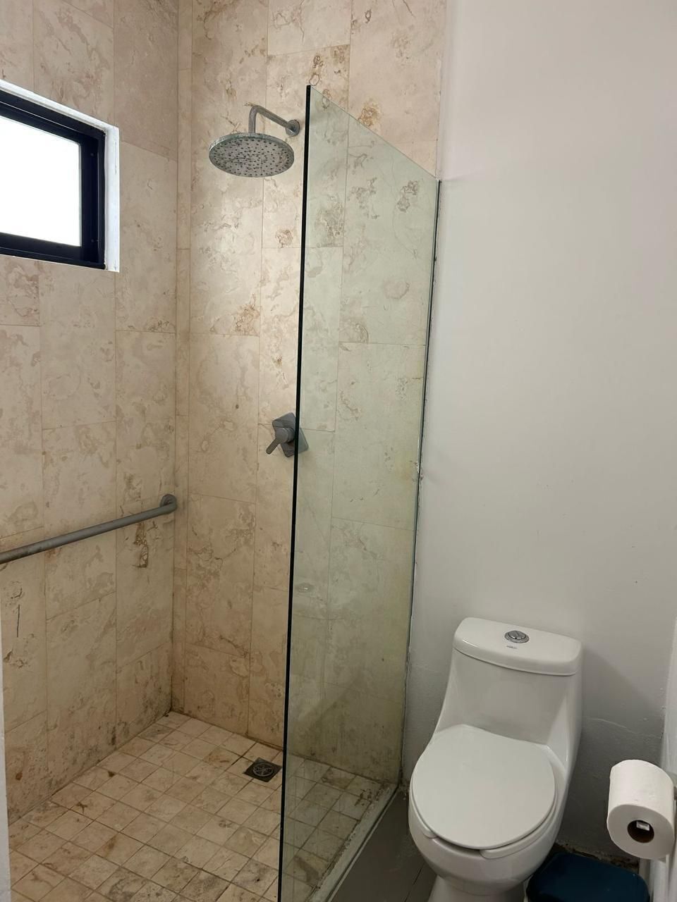 En planta alta recámara principal con clóset vestidor amplio y baño con cancel de vidrio templado y puerta de privacidad para inodoro , techo a doble altura y ventanal con vista a la terraza