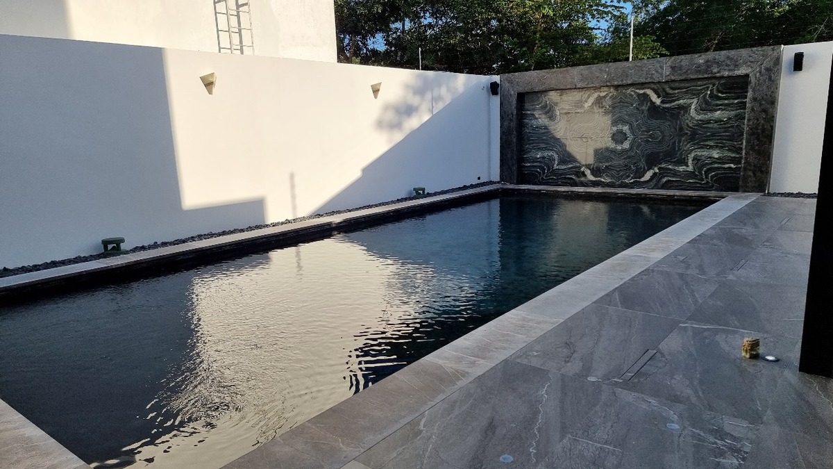 - Pool of 13 x 5 m, with 3 depths, and Santo Tomas marble edge with Sanblast and anti-slip, chukum bottom and crushed black granite that produces an emerald green effect.