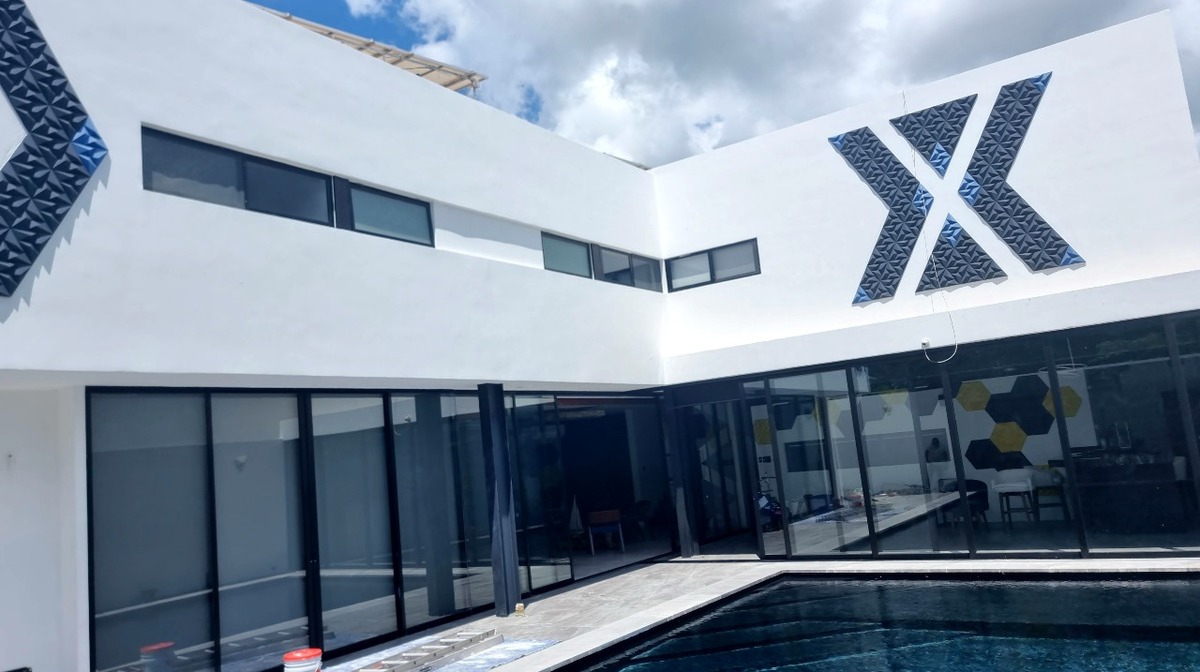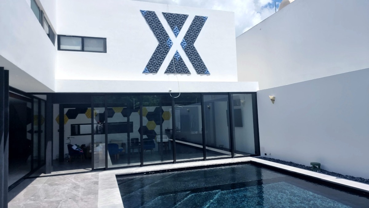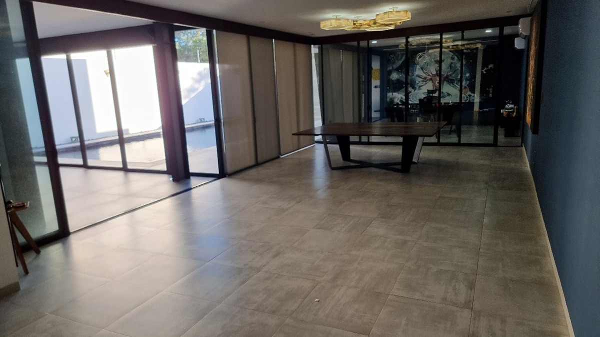 - Air-conditioned social area of 7 x 4.5 m, with H beams, overlooking the pool with 7 Italian doors with smoked black glass.