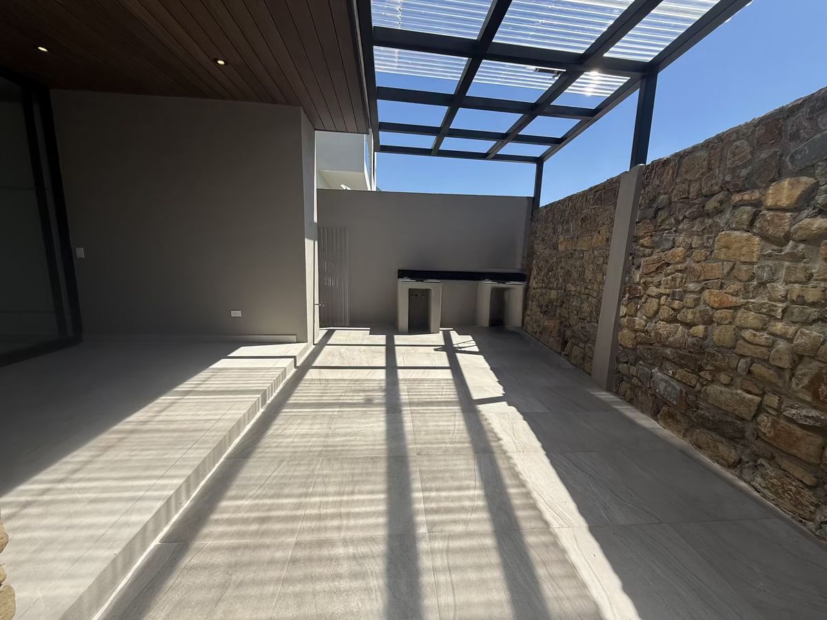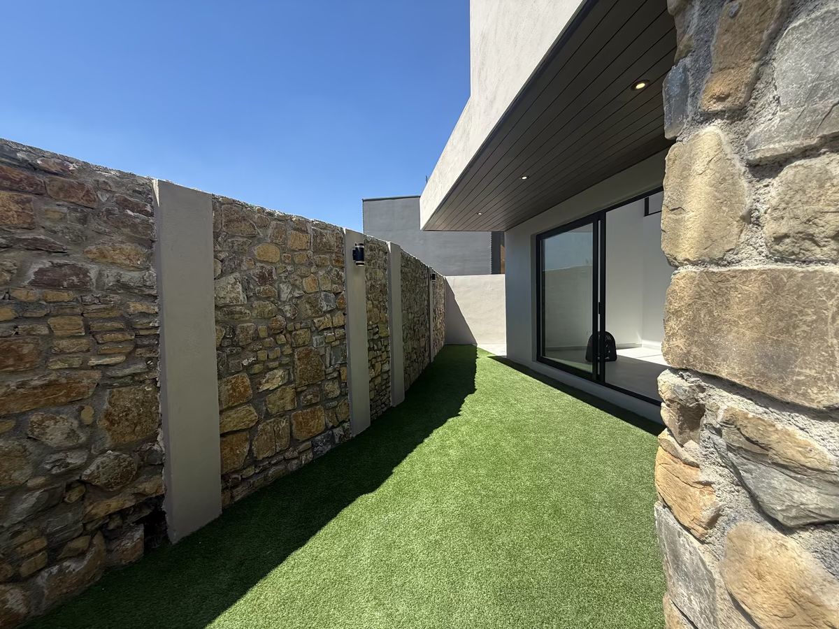 Jardín con pasto sintético, pérgola, terraza y asador