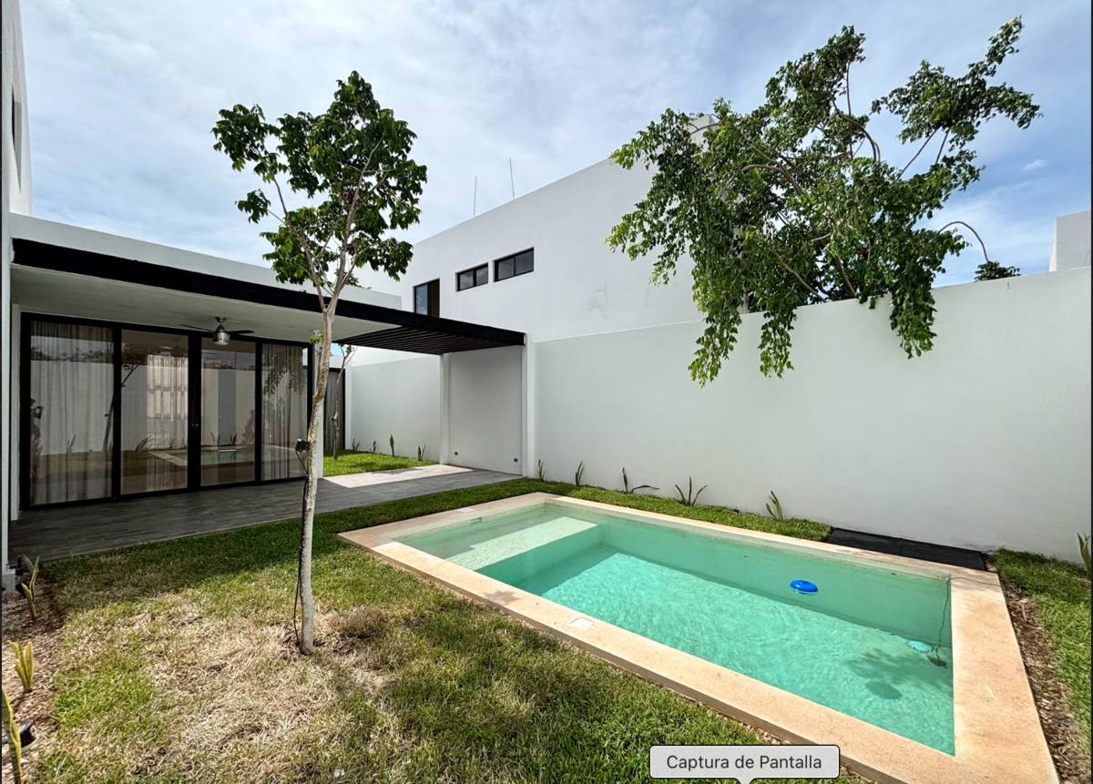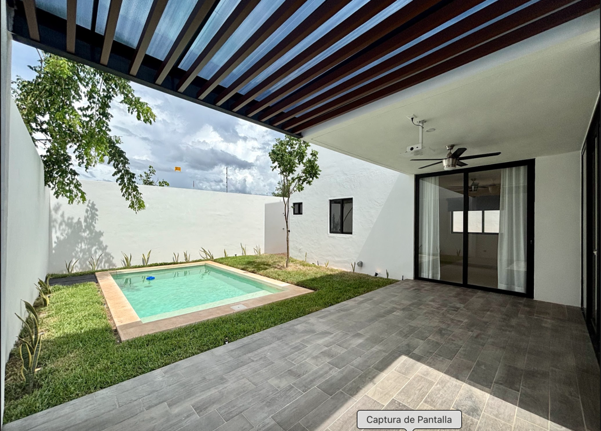 - Alberca con acabado chukum y áreas de pasto en rollo en el jardín