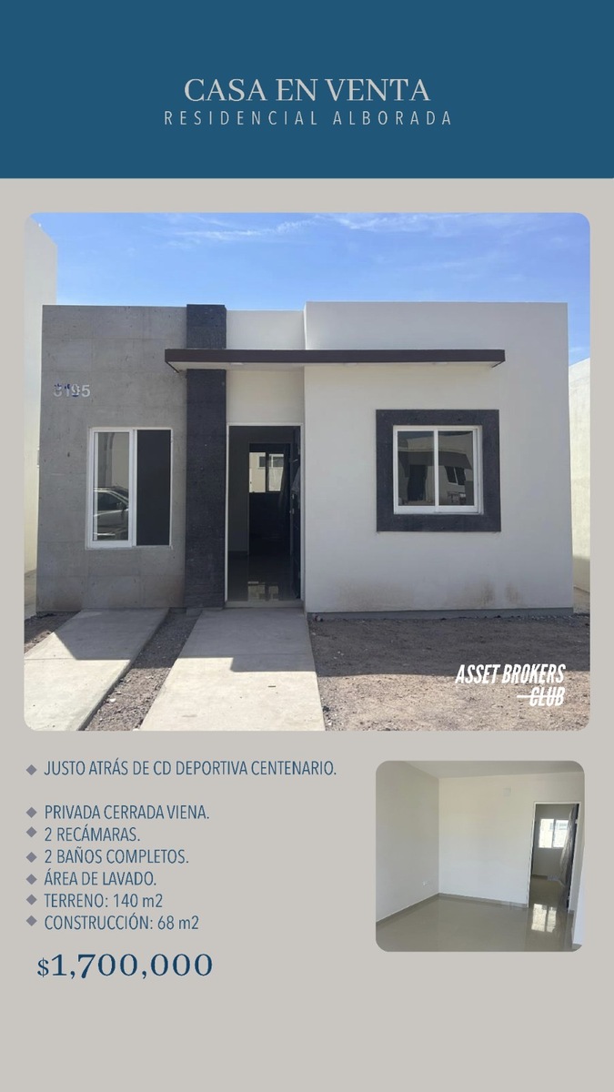 CASAS EN VENTA, RESIDENCIAL ALBORADA !! JUSTO ATRÁS DE CD DEPORTIVA CENTENARIO. PRIVADA CERRADA VIENA. 2 RECÁMARAS. 2 BAÑOS COMPLETOS. ÁREA DE LAVADO. TERRENO: 140 m2 CONSTRUCCIÓN: 68 m2 PRECIO: 1,700,000