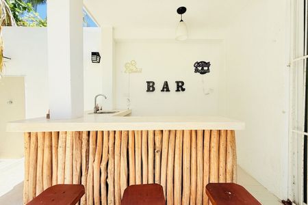 -Rooftop with Jacuzzi, covered area with loungers, full bathroom, bar with sink for dishes.