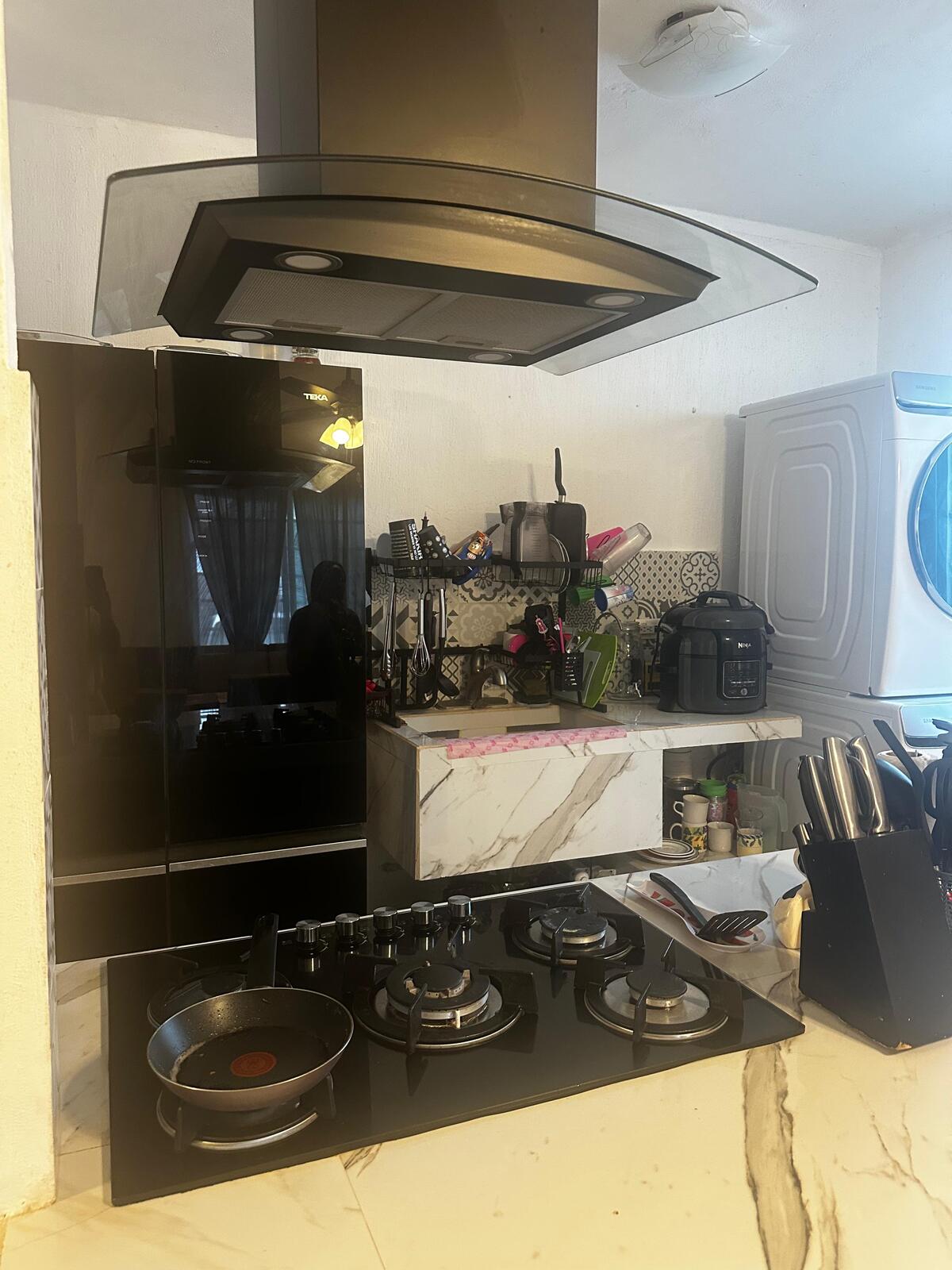 • Cocina con Península con parrilla y campana, refrigerador, horno, air fryer ninja.