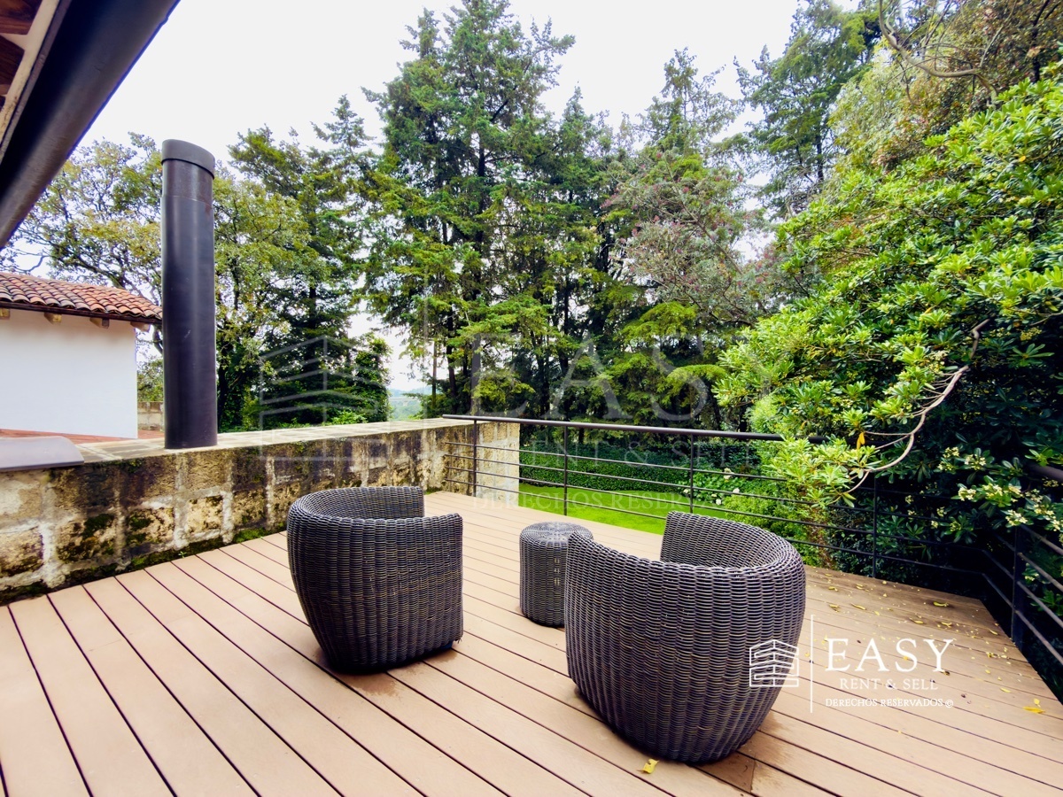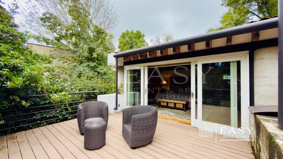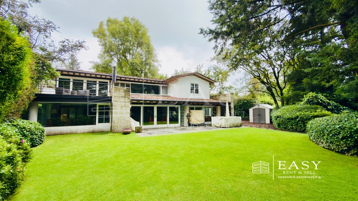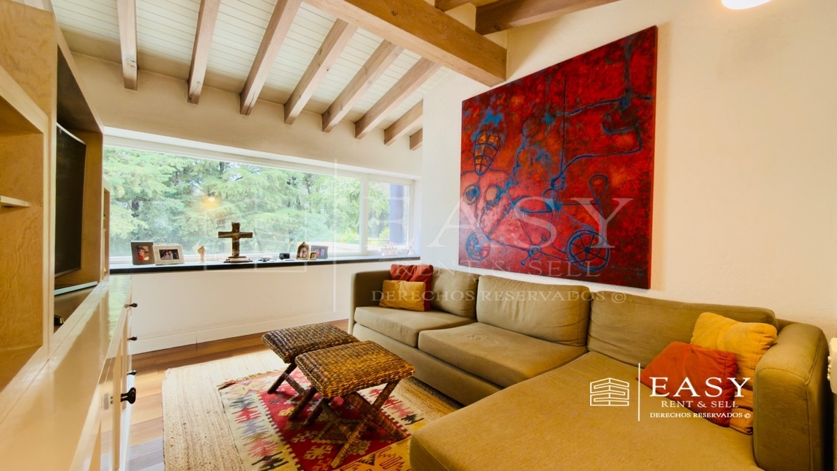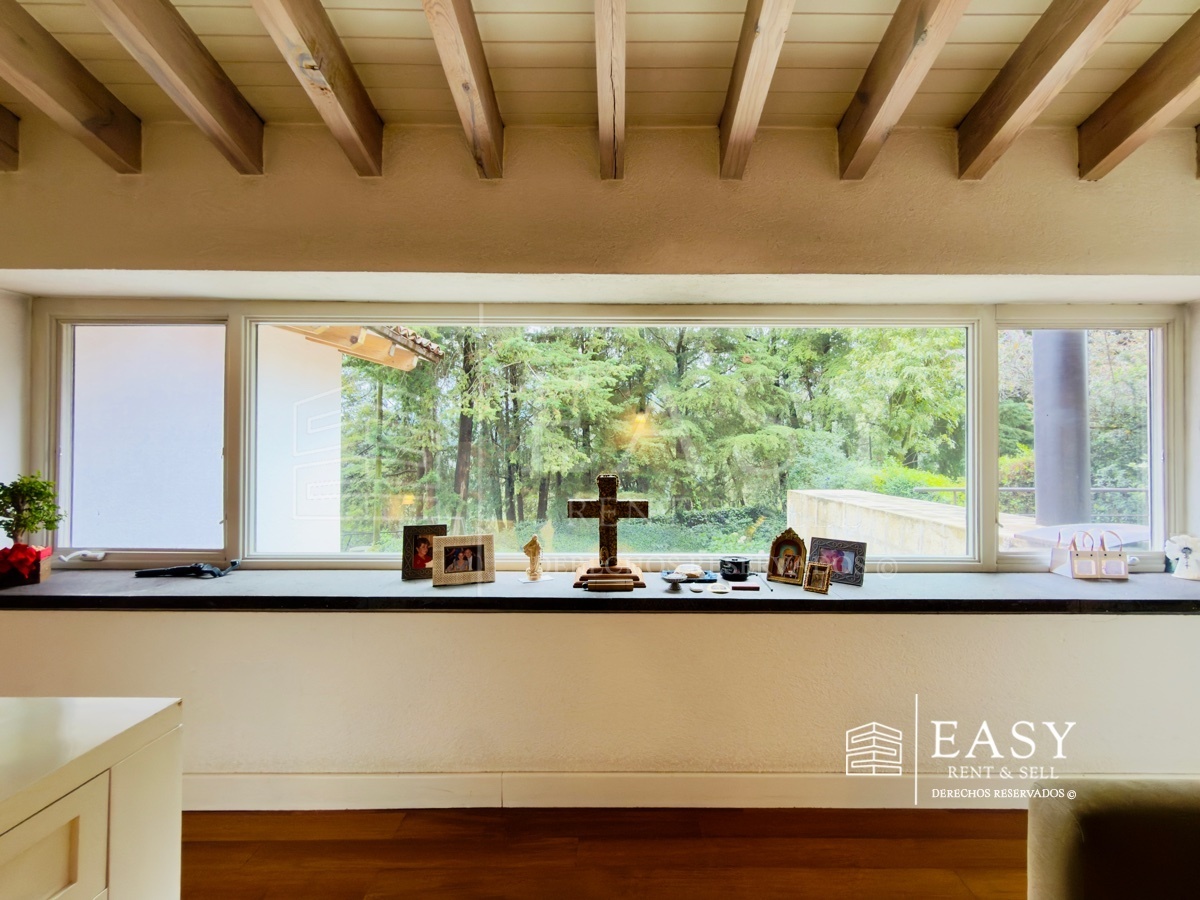 Dispone de sala, comedor, family room y sala de estar con bar, todo con ventanales de piso a techo que se abren hacia un jardín plano de 350 m2 y una hermosa vista al bosque, creando un espacio perfecto para convivir, relajarte y disfrutar de la naturaleza sin salir de casa, integrándose con el exterior. Tres recámaras con baño y vestidor (la principal con terraza privada y vista panorámica). Además, incluye un estudio cerrado con medio baño, adaptable como cuarta recámara u oficina.
