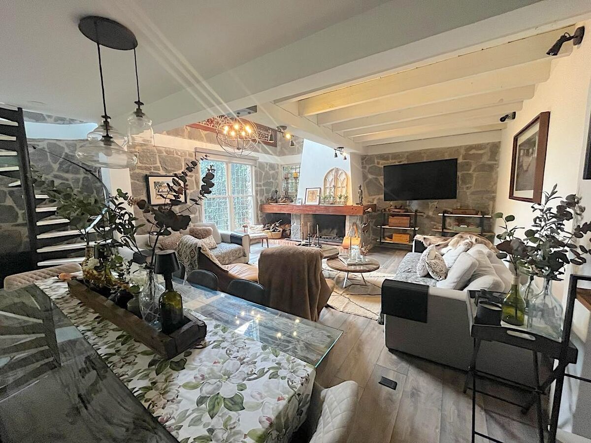 Fire pit de diseño único, elaborado con piedra de un antiguo molino de mina: un punto focal rústico e histórico para reuniones nocturnas.