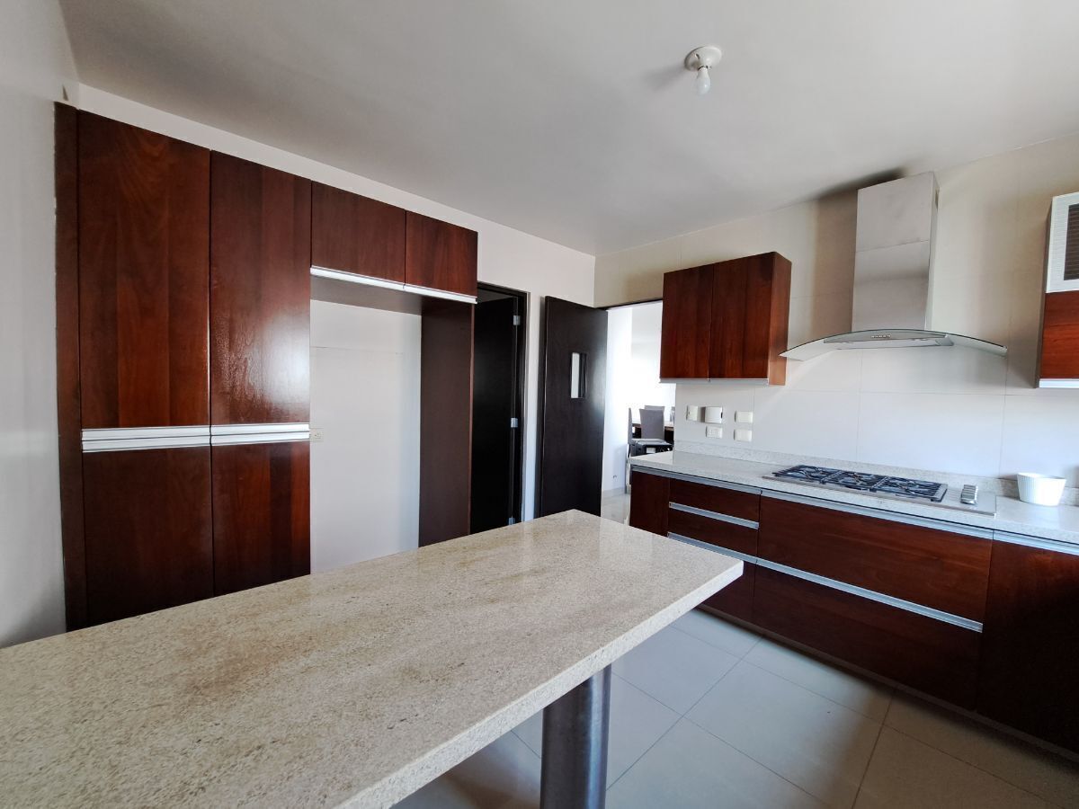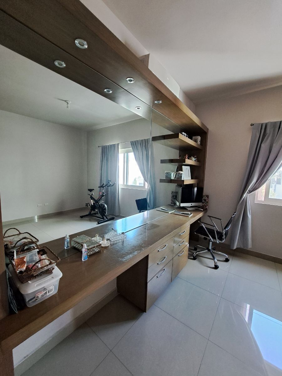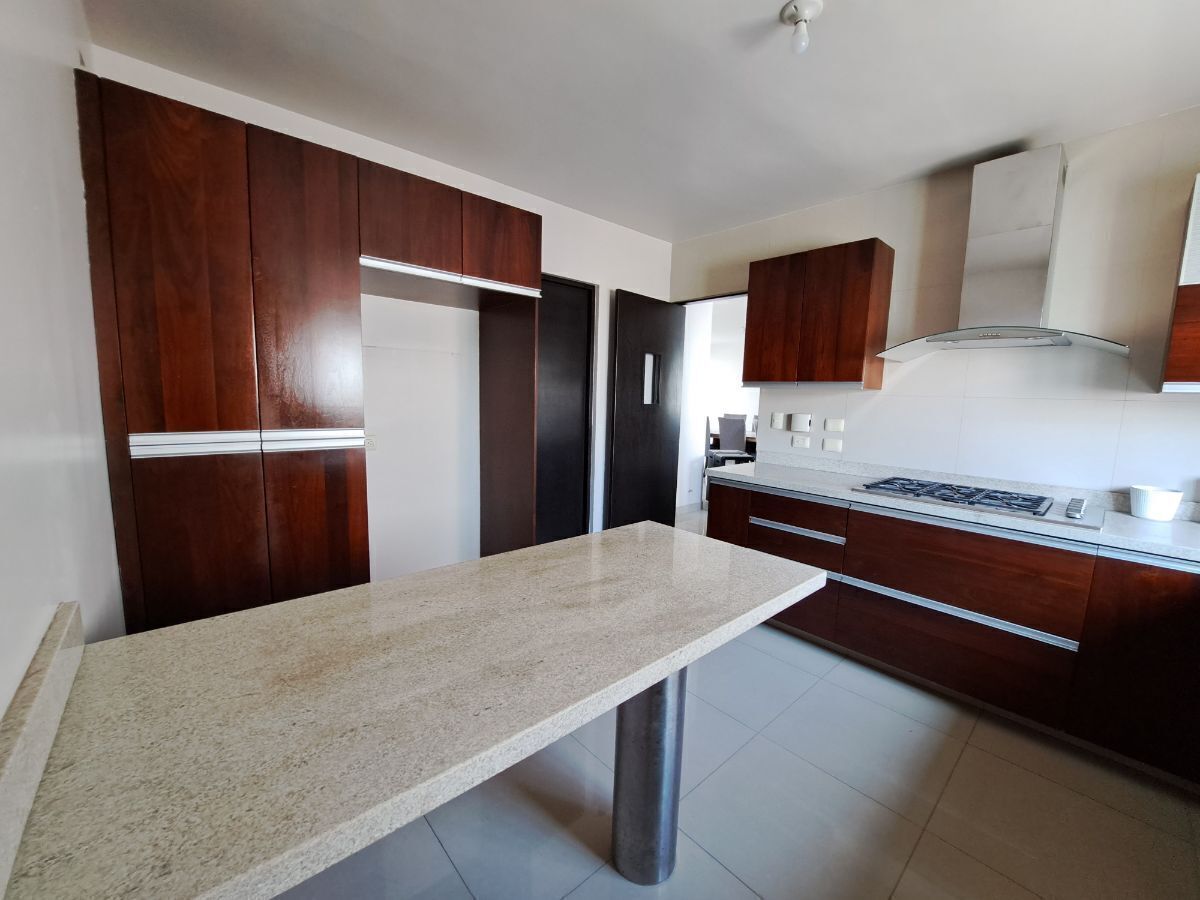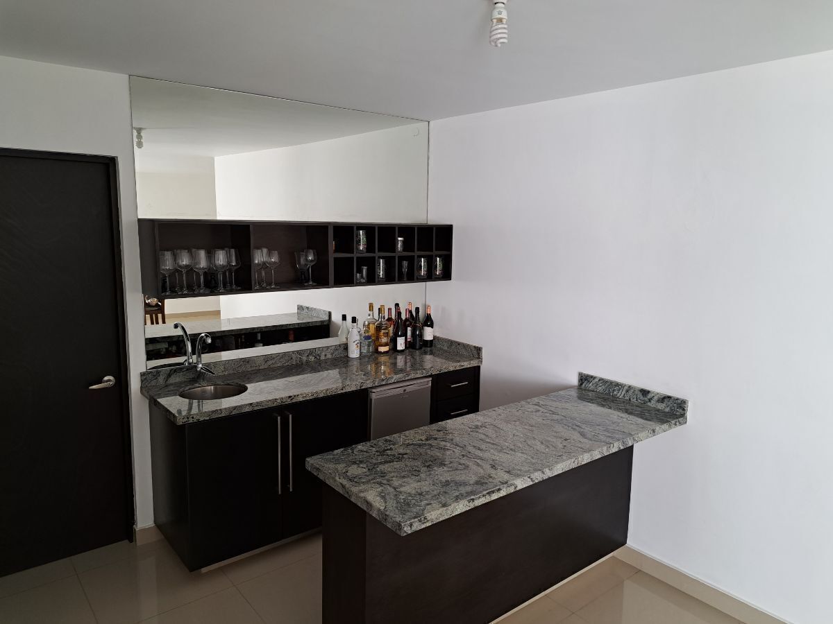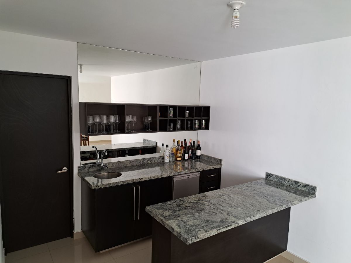 Área social muy amplia, con mueble de bar con cubierta de granito, espejo.