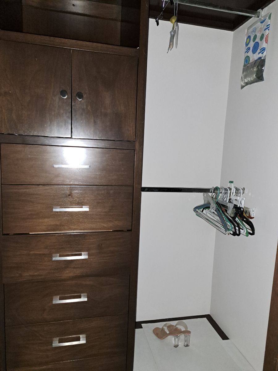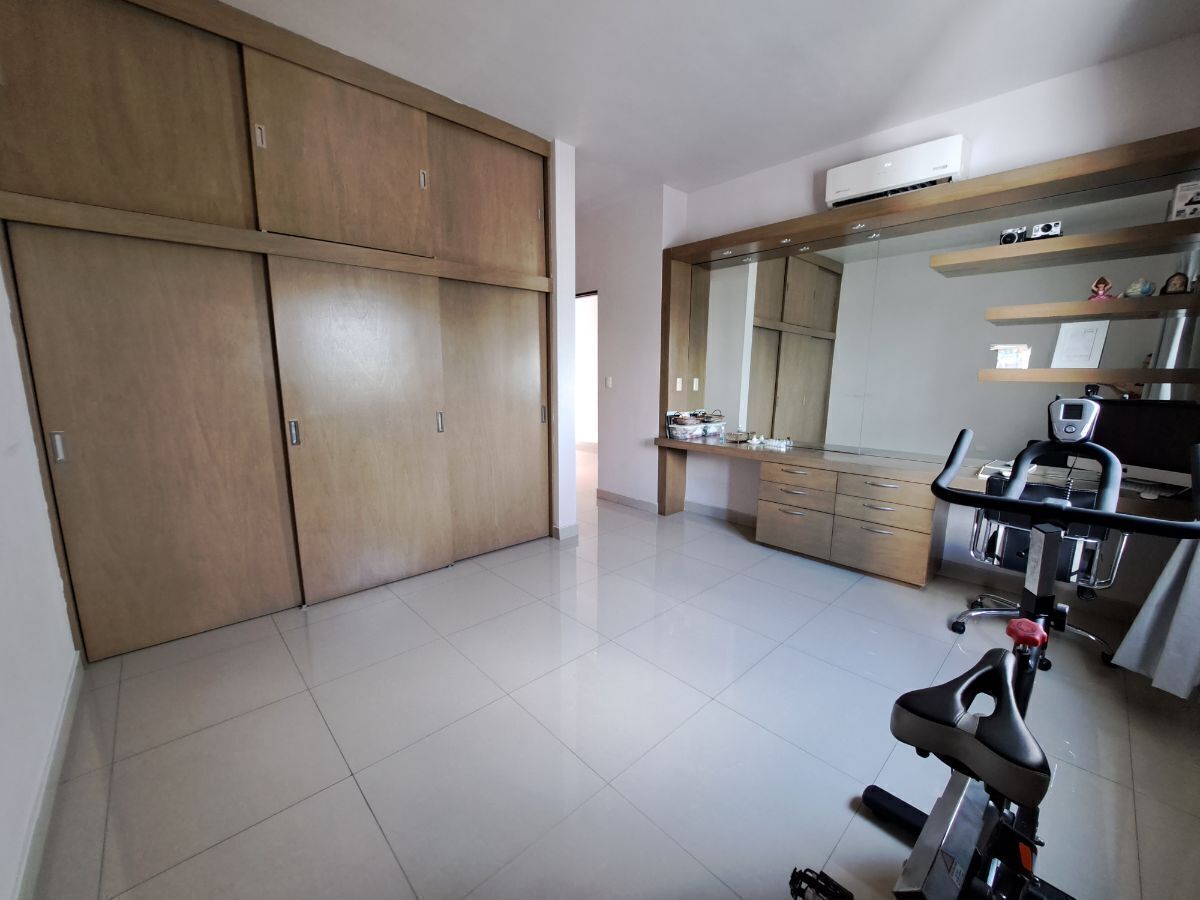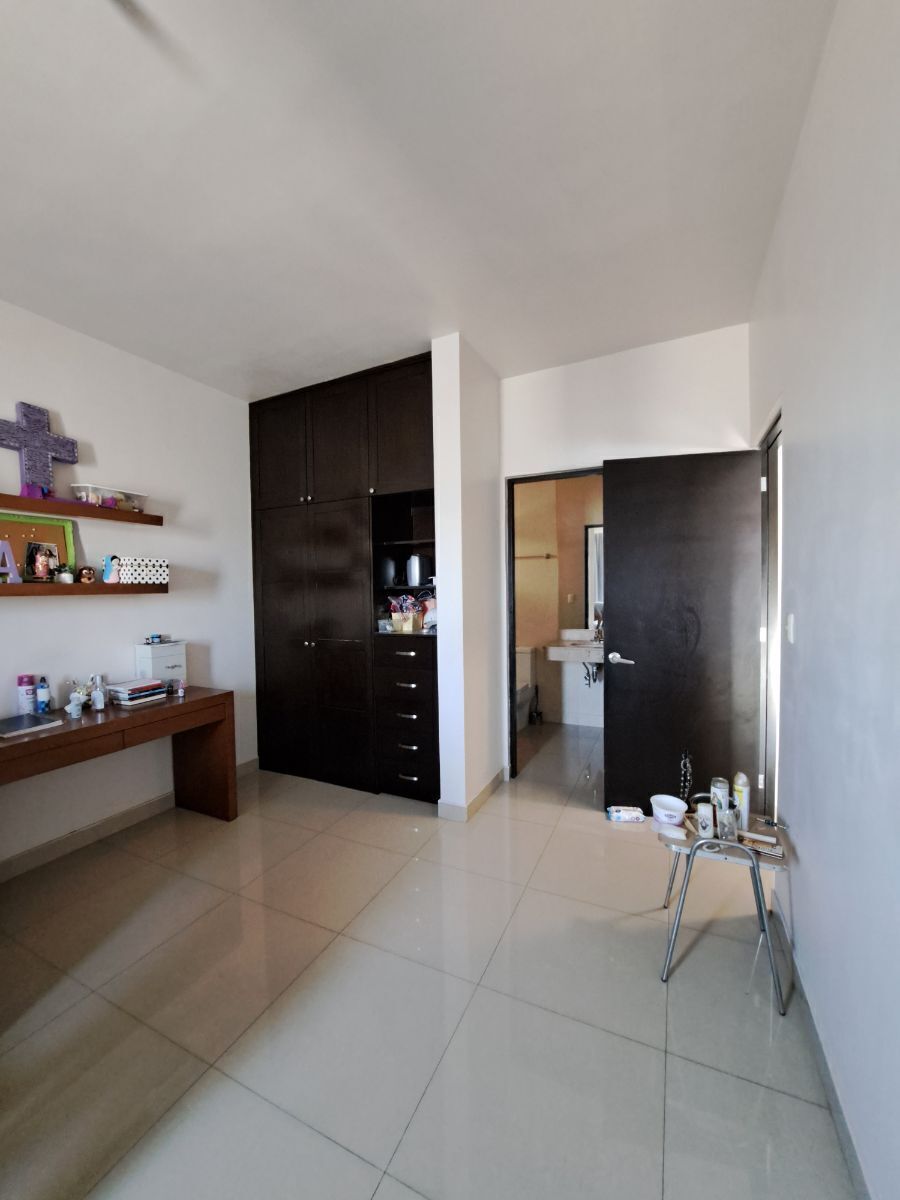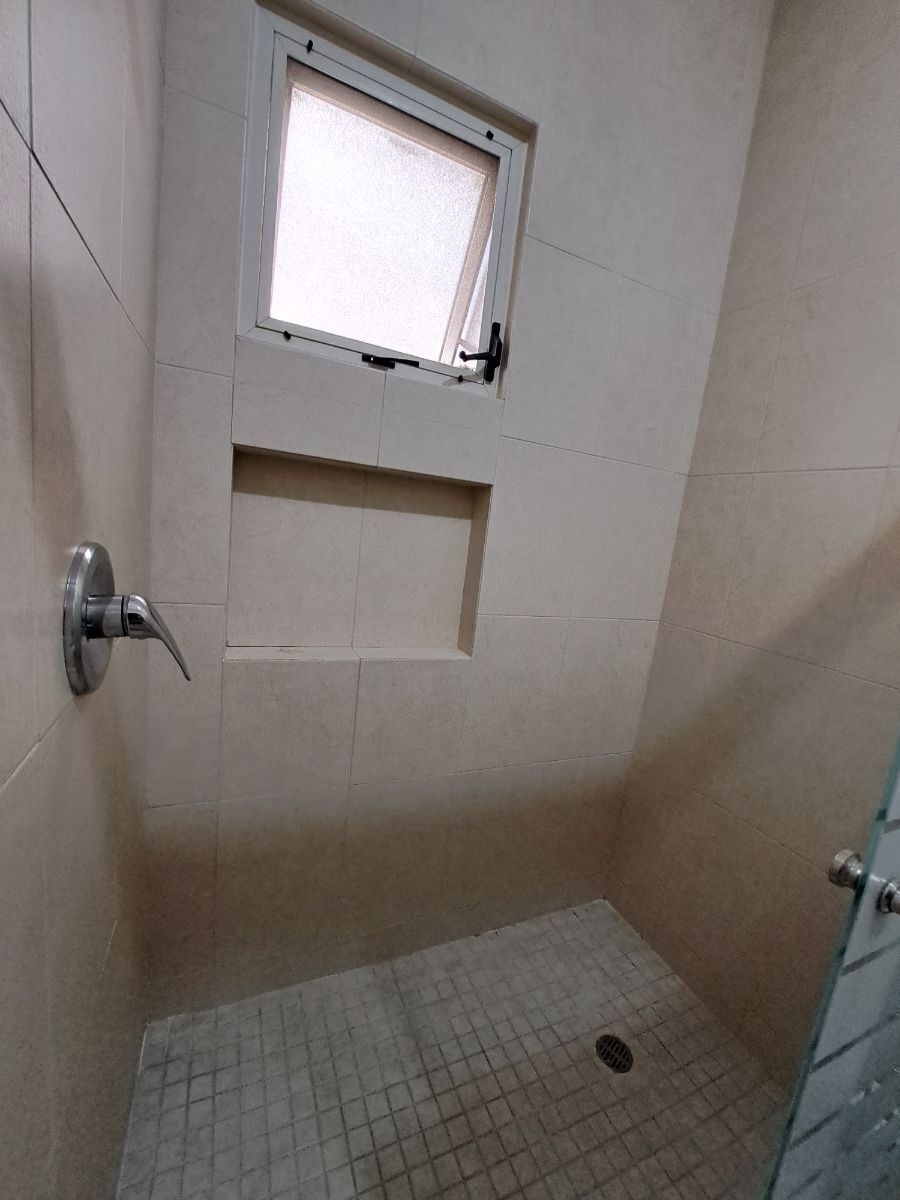 Recámara secundaria 2, baño completo con cancel de vidrio, closet de pared, mueble de madera para camas empotrados.