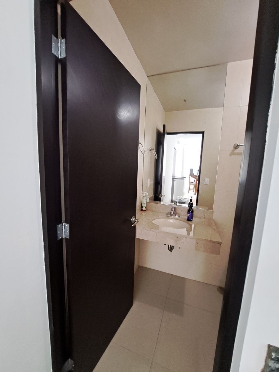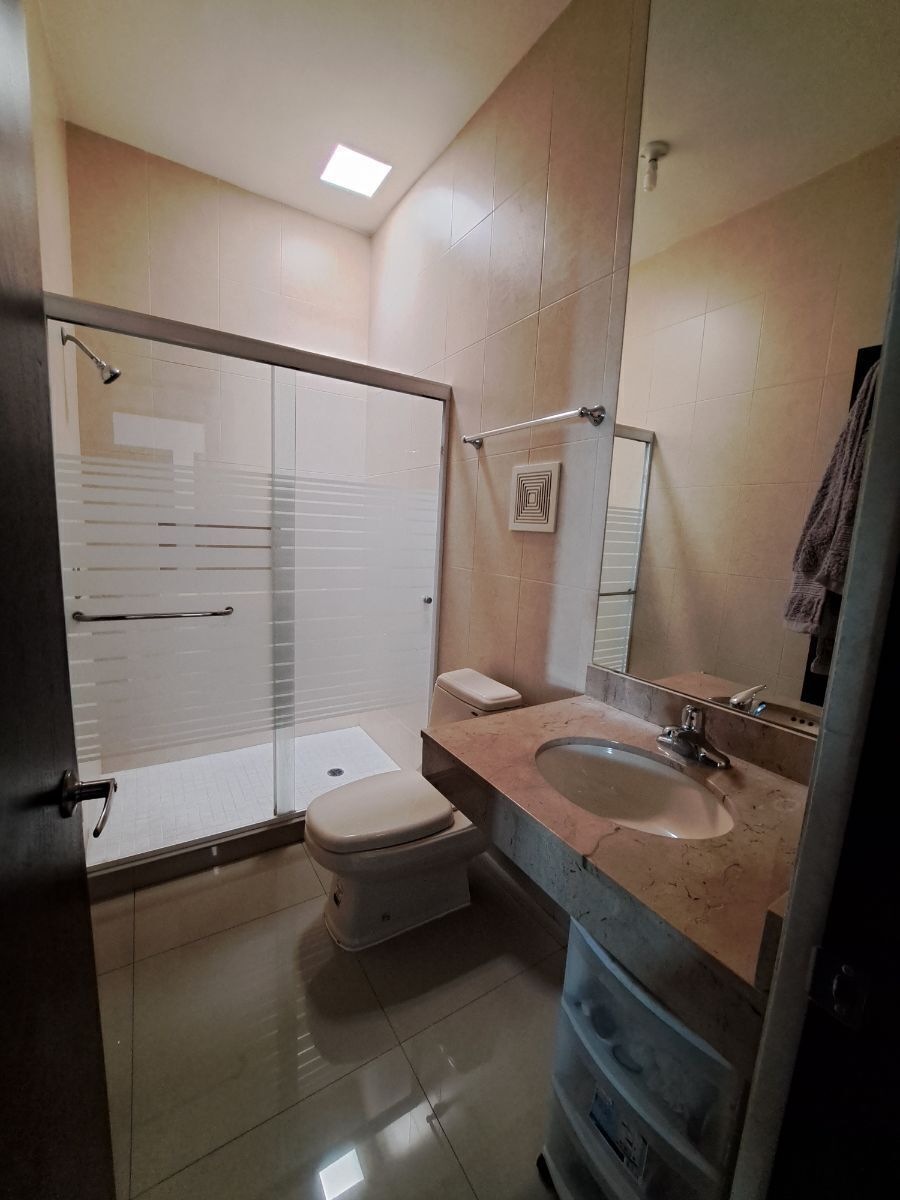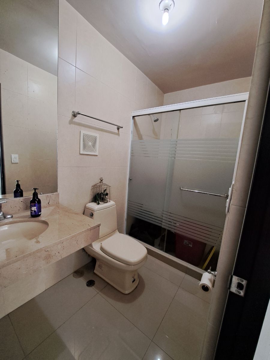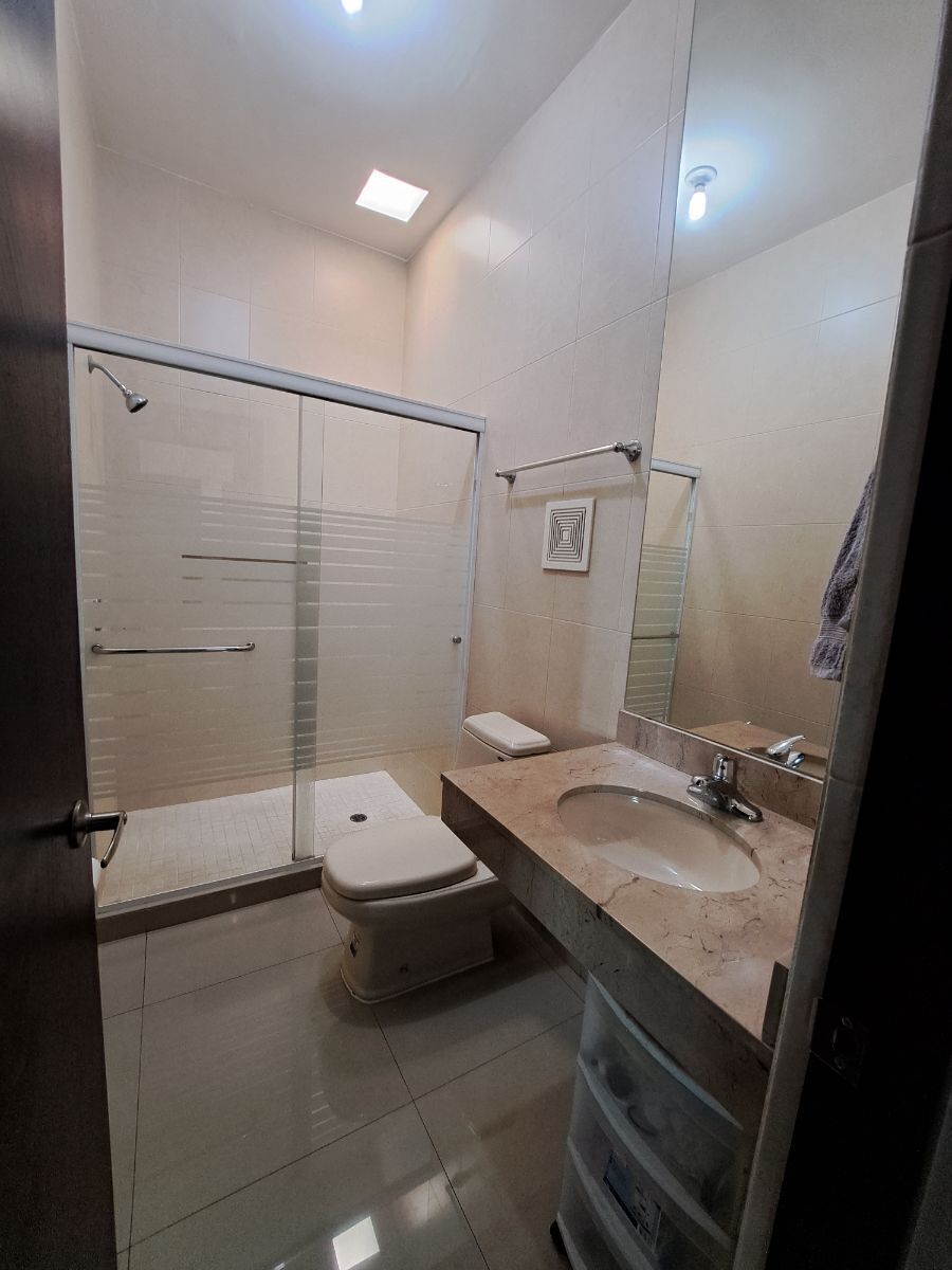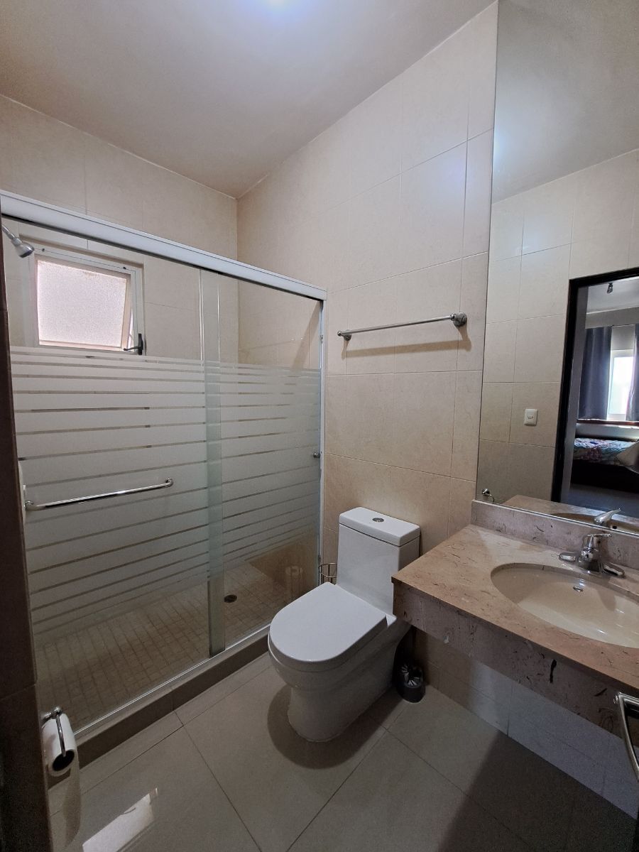 Recámara secundaria 1, baño completo con cancel de vidrio, closet de pared, mueble con espejo y cajonero.