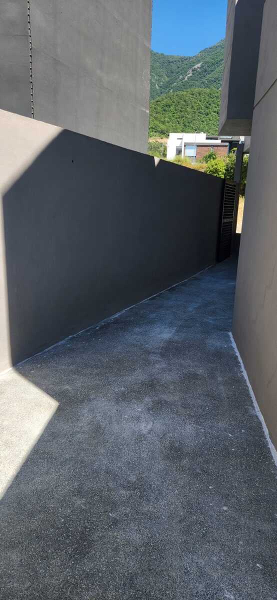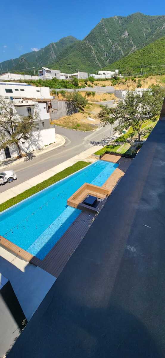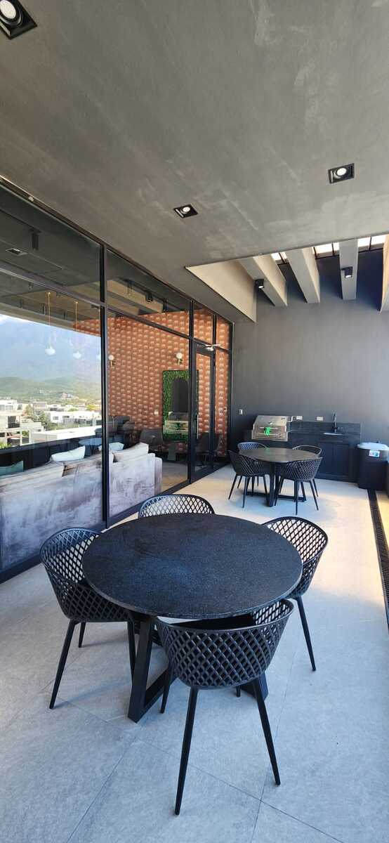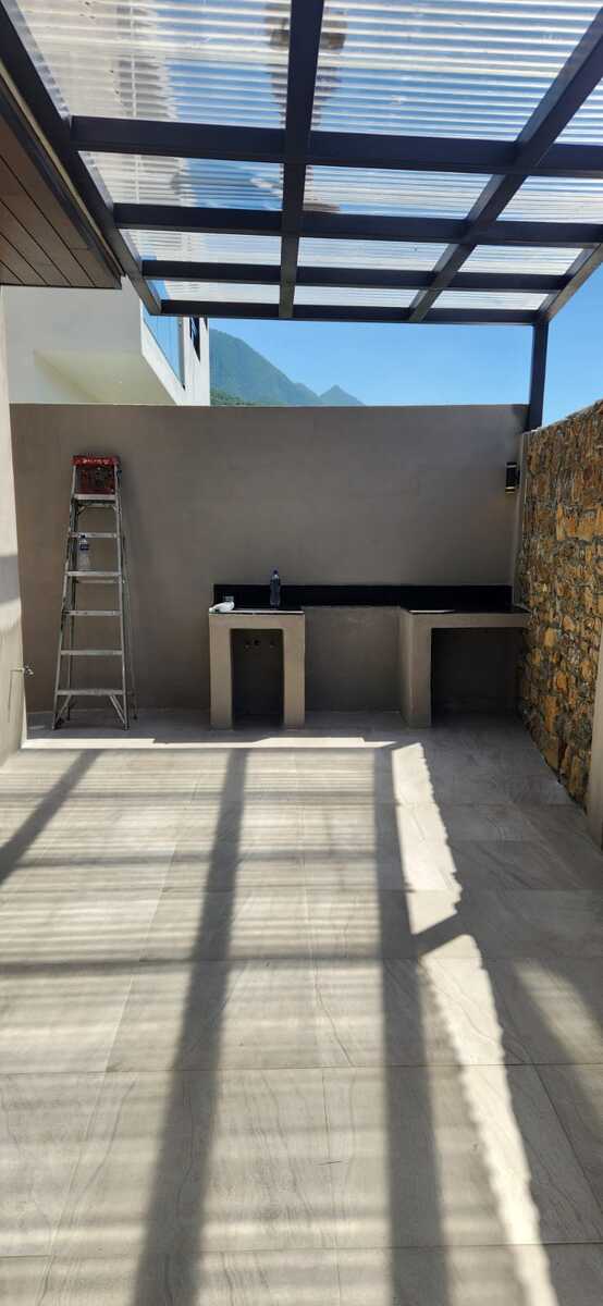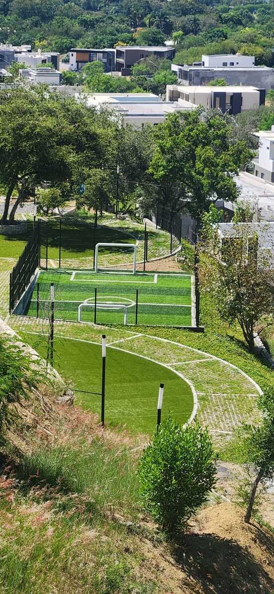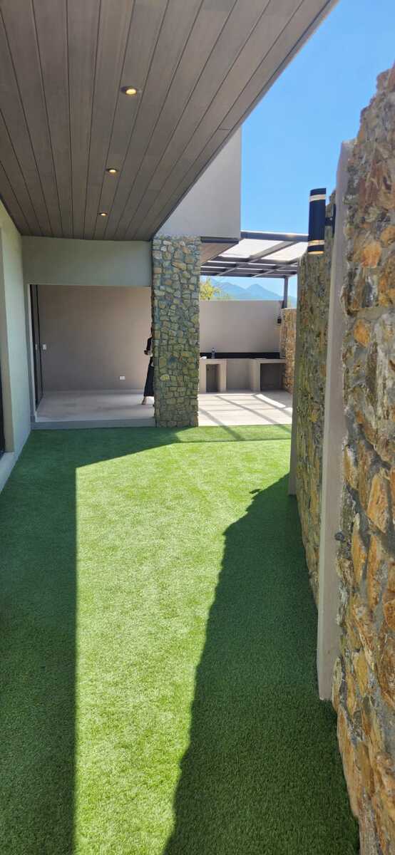 Jardín con pasto sintético, pérgola, terraza y asador.
