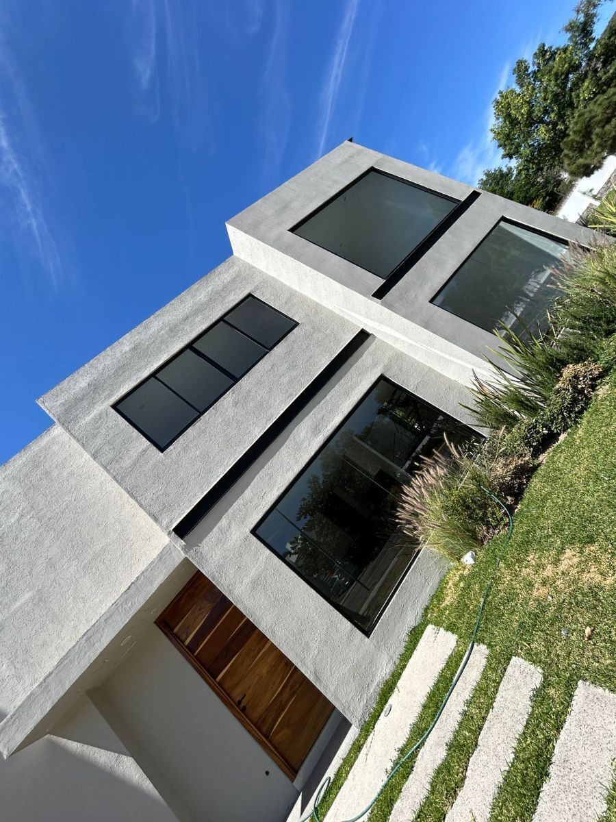 Casa moderna de dos niveles con amplia distribución de espacios, jardín con riego automático, entrada principal e independiente de cochera a la casa y ventanales corredizos.