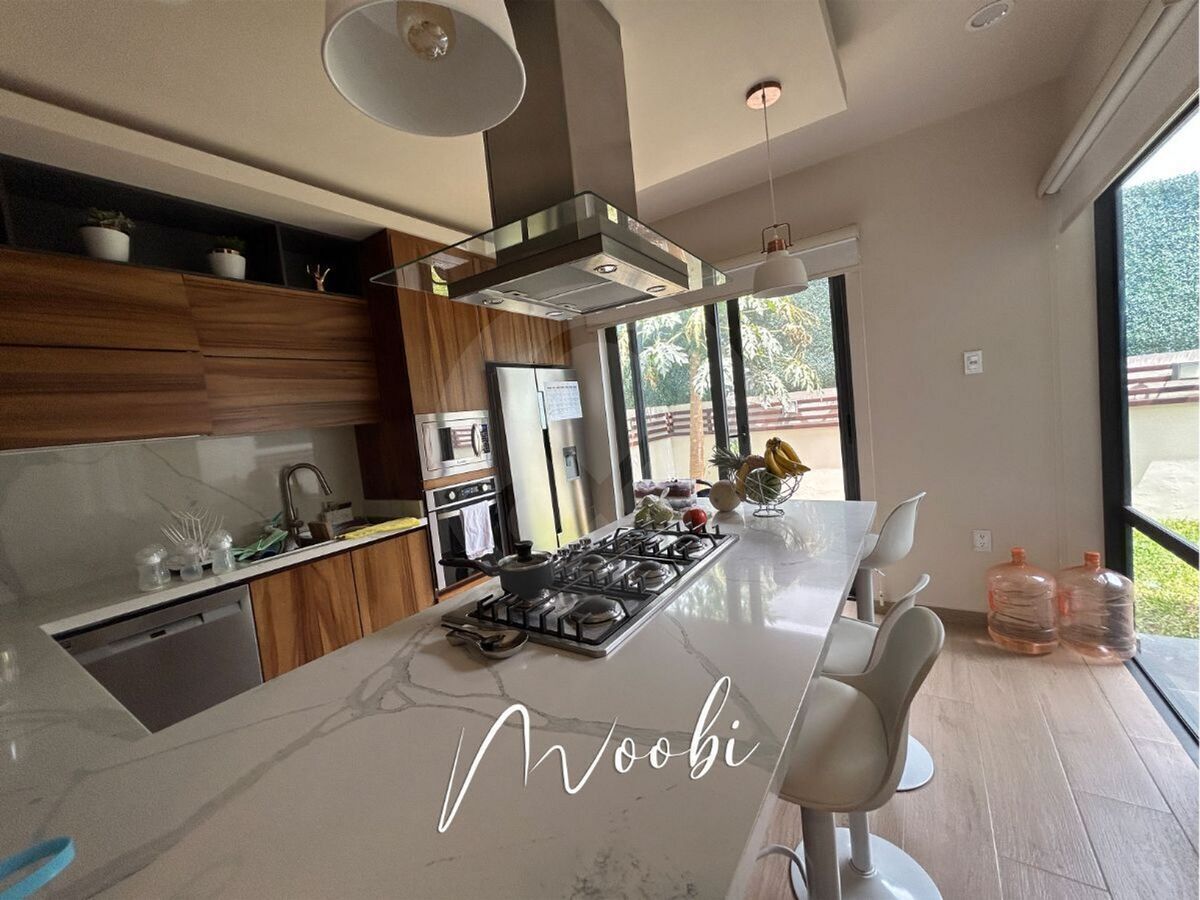 La casa se entrega con 3 aires acondicionados y cortinas eléctricas, teniendo en cuenta que tiene paneles solares por lo que el costo de luz es muy bajo. Toda la madera de la casa es parota.
