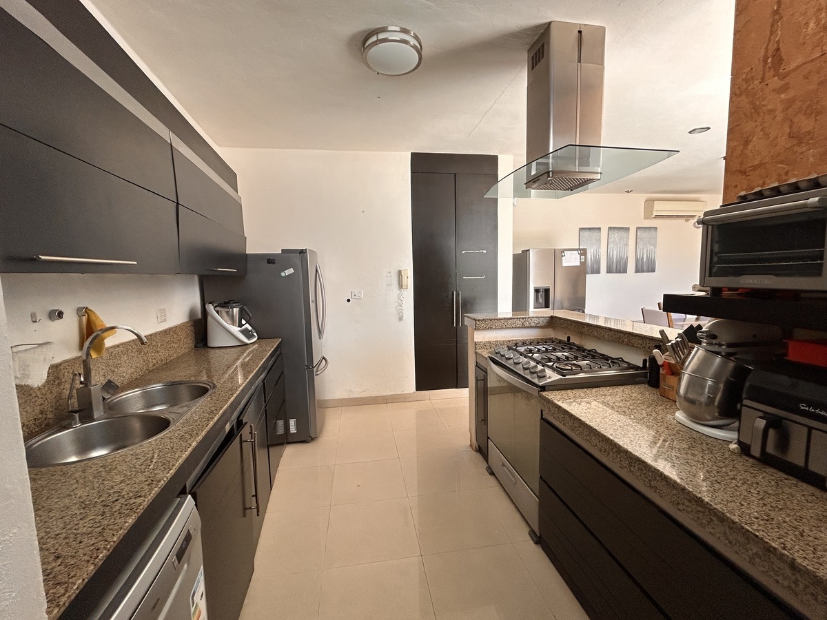 *Cocina equipada, con meseta de granito y gavetas superiores e inferiores, alacena y tarja de acero inoxidable, llave mezcladora y campana extractora