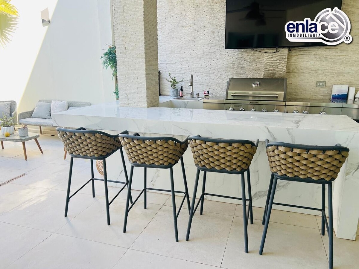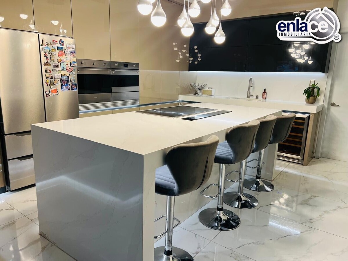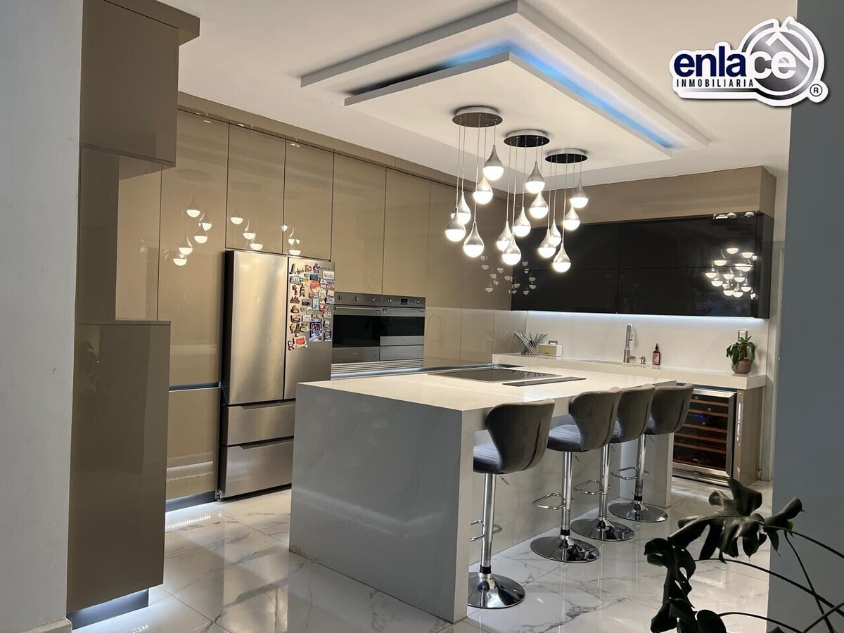 KITCHEN equipped with cane, smeg ovens, smeg plate warmer and food cooler, motion sensor faucet, the entire kitchen and bar have automated led lighting with motion detectors, 90” electric grill and retractable electric hood, double quartz sink, panelable smeg refrigerator and TV screen.Casa en venta en Colinas del Saltito. Cercana a escuelas, supermercado, cines.