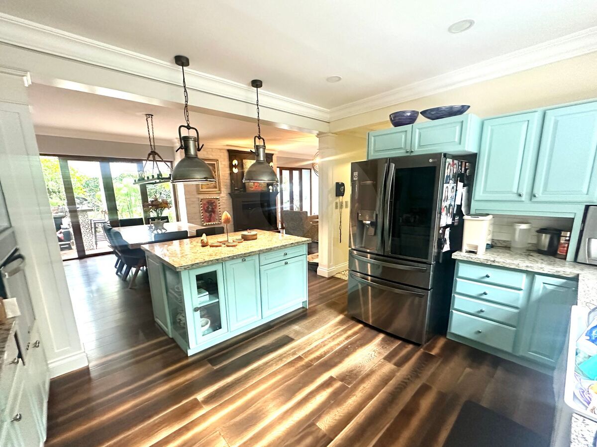 Sala con chimenea, comedor y cocina abierta