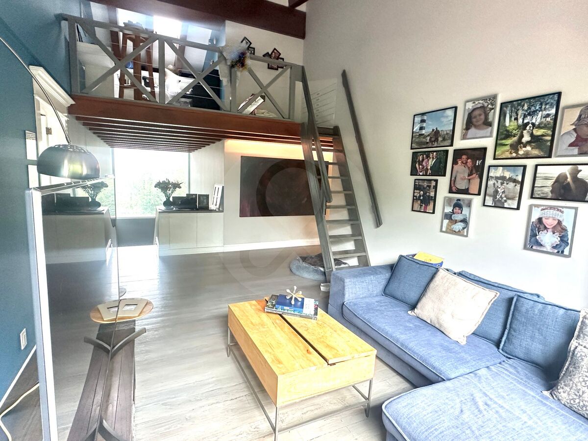 Sala de TV de doble altura con tapanco que funciona como oficina