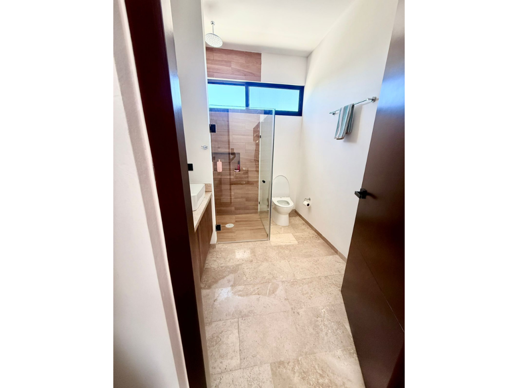 Recámara principal con clóset vestidor, baño completo con doble lavabo.