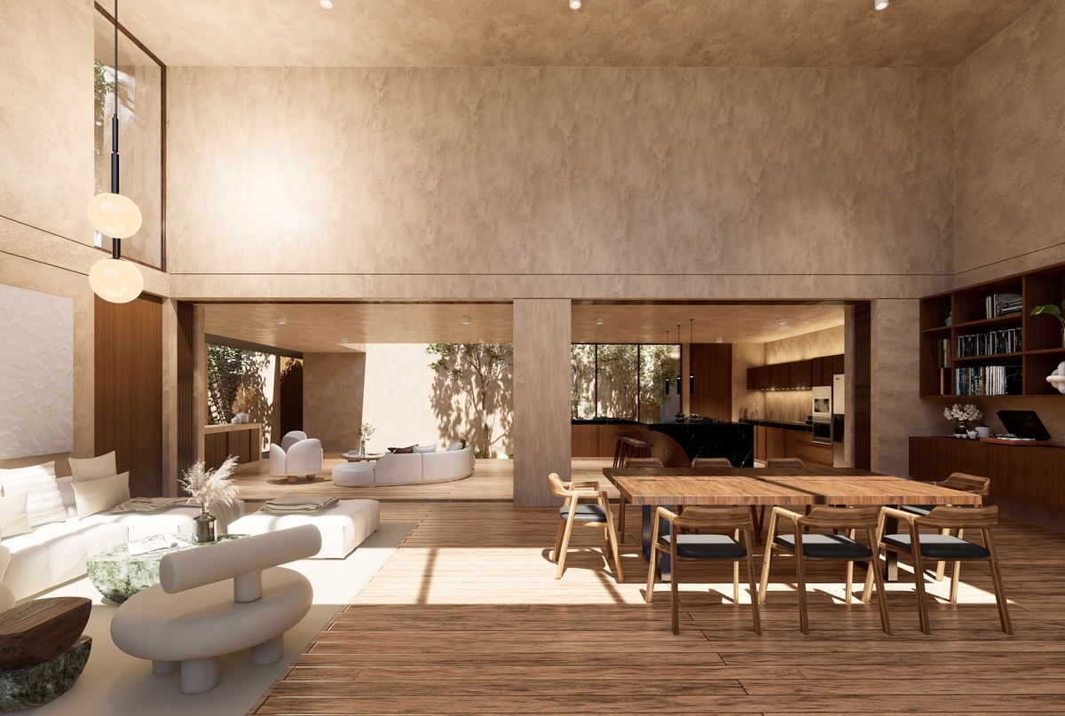 Sala - Comedor de doble altura con vista al segundo patio y conexión con la