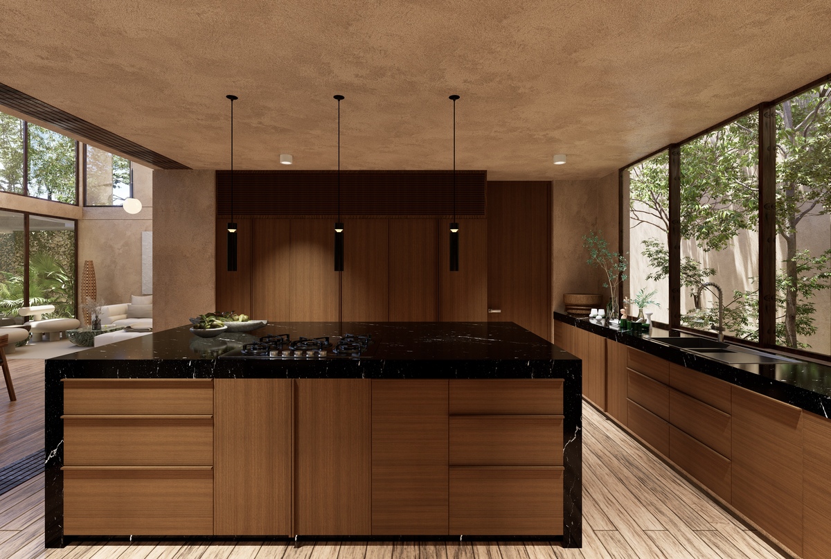 Cocina con isla, opción de abertura total al comedor, acceso a la terraza y vista al primer patio.
