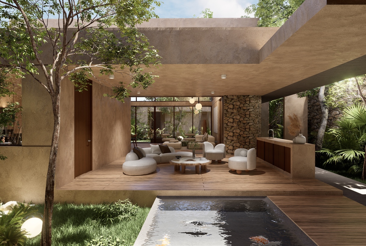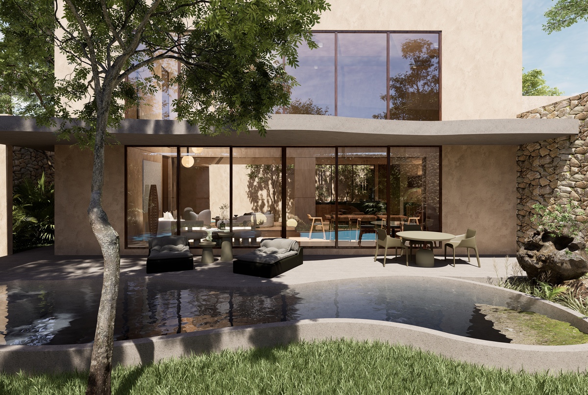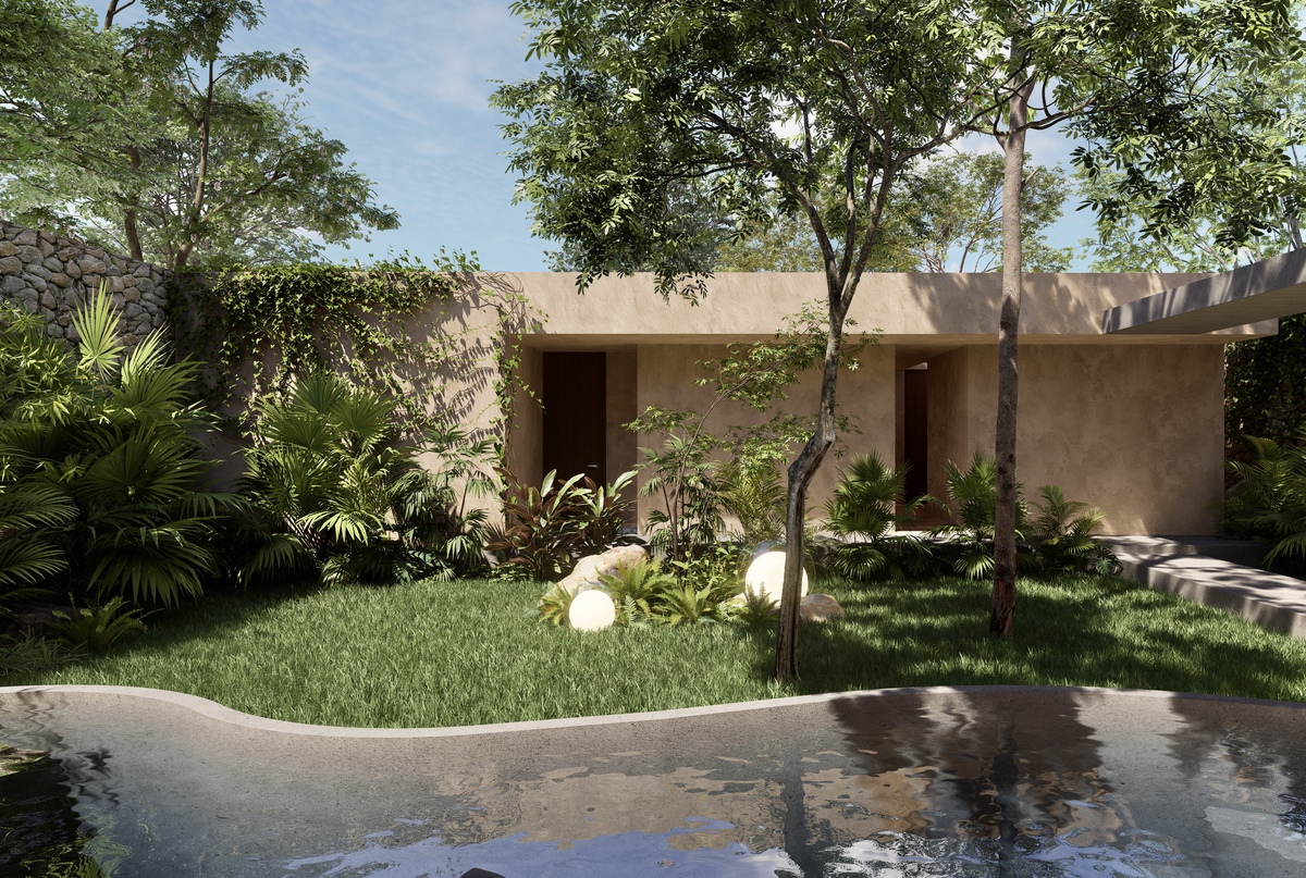 Andador lineal que conecta cada sección de la propiedad acompañado de un jardín paralelo.