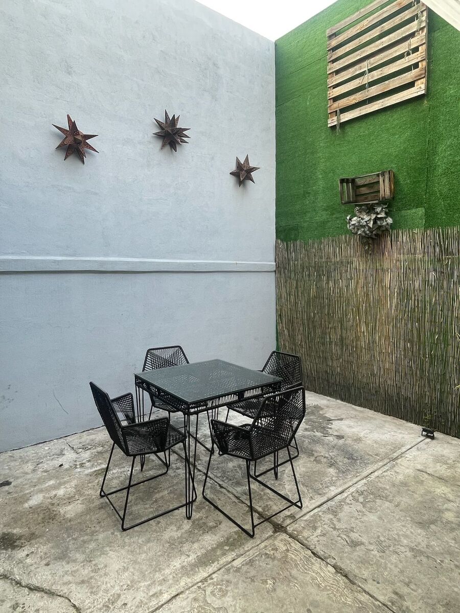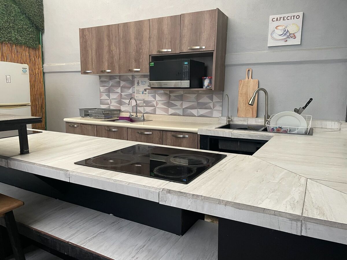 Terraza exterior con cocineta y lavabo, área para comedor, microondas excelente para relax de los empleados y o reuniones con clientes,. Hasta para mas de 20 personas