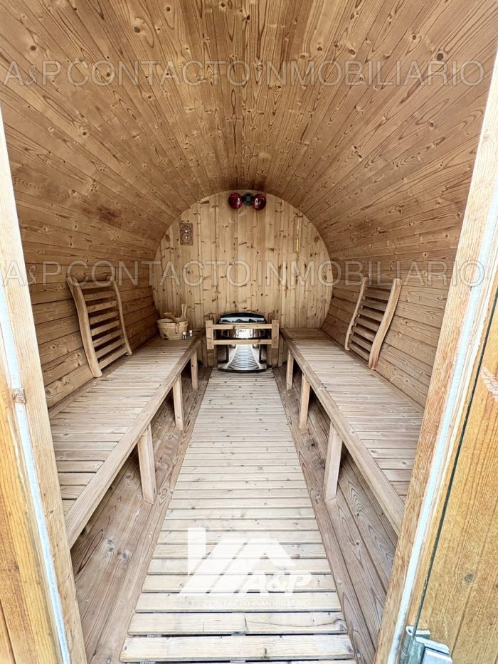 Jardín privado de **140 m² con sauna para 6 personas.