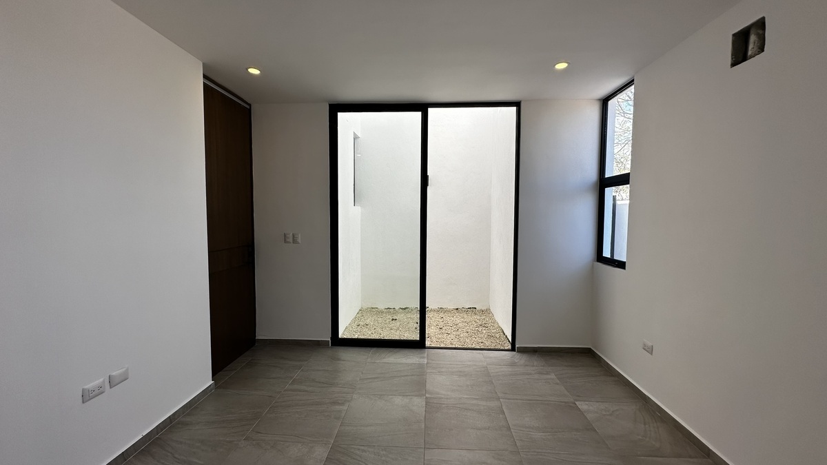 Habitación principal con clóset vestidor y baño completo, vista al jardín interno.