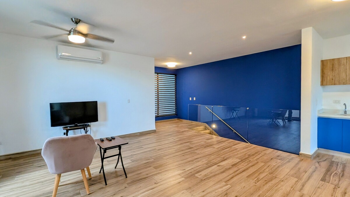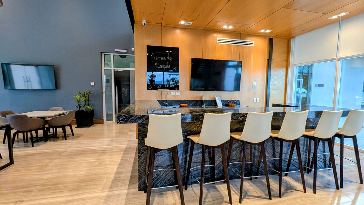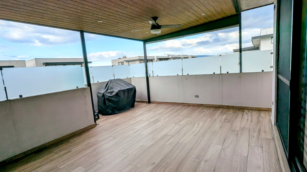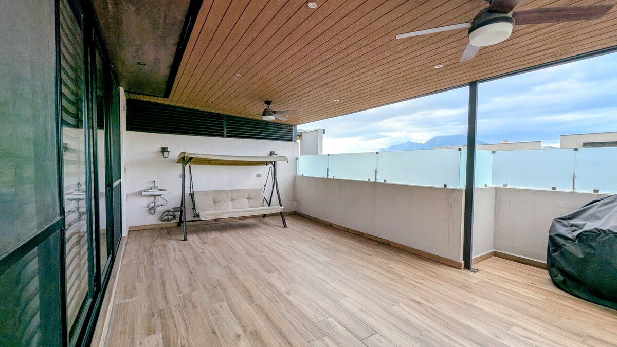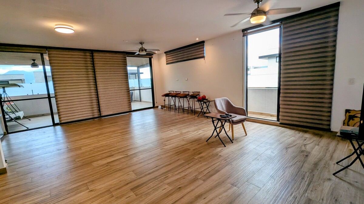 Tercer nivel: área social con cocineta, bar y sala de TV. Terraza techada con deck de más de 50 m² y columpio incluido.