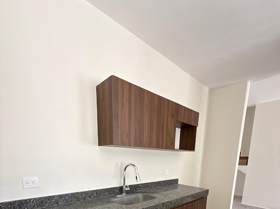 • Kitchen drawers under the countertop (not bar) and two on the upper part with space for a microwave made of melamine.